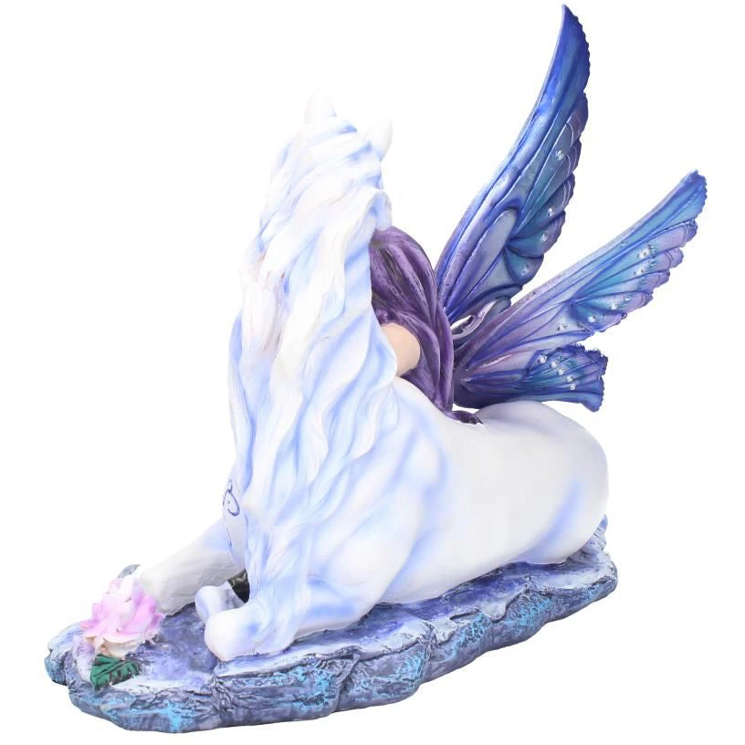 This beautiful fairy figurine is perfect from bringing some serenity into your life. Lying on a snow-covered forest floor, this white unicorn is subtly shaded with pearlescent yellows, pinks and blues. Their long white mane hangs down as their head is turned, golden horn proudly pointing forwards. They are gazing towards a young, purple-haired fairy, leaning on their right flank and seemingly asleep, her blue and purple butterfly wings unfurled behind her. Her long jade green skirt flows along the ground around her, and her thigh has a curling purple motif tattooed on – the same motif as is on the unicorn’s front. Cast in the finest resin before being lovingly hand-painted, this fantastic fantasy figure is a great way to add an aura of calm and magic to any room.