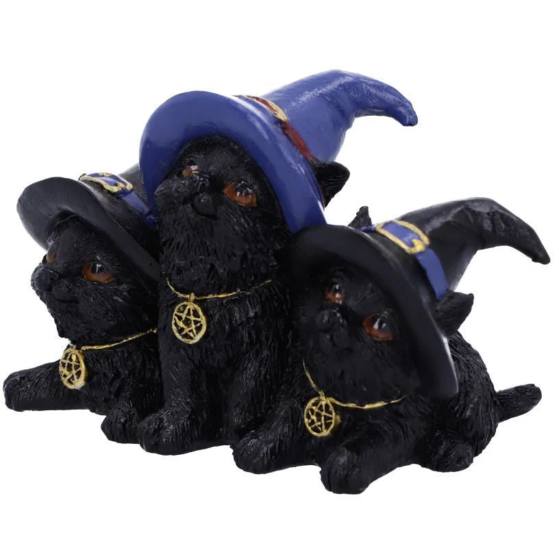 These charming cats are is cast in high-quality resin before being painstakingly hand-painted. Sitting side by side with a Witches hat on each of their heads, they look up with adorable eyes. Each wearing a pentagram talisman around their necks, these pieces are the perfect gift for the charming witch in your life.
