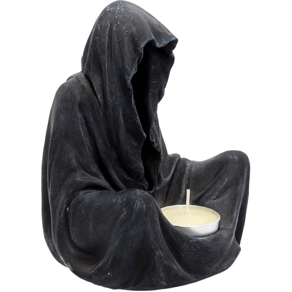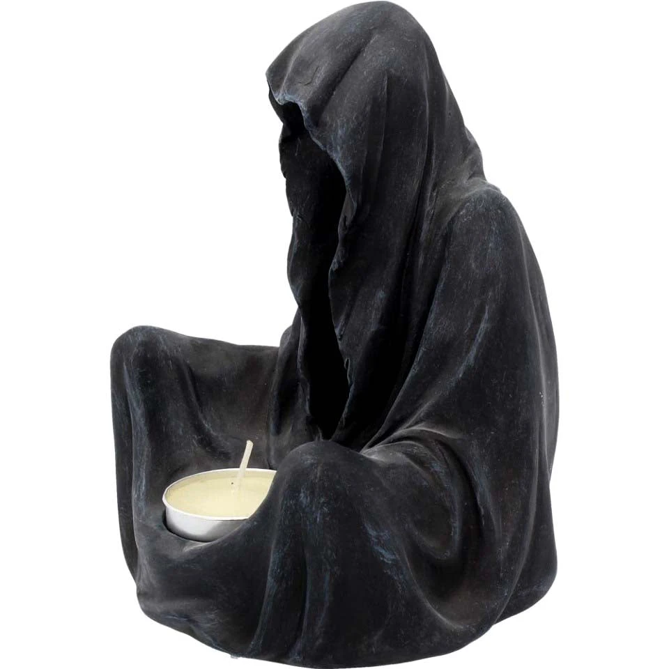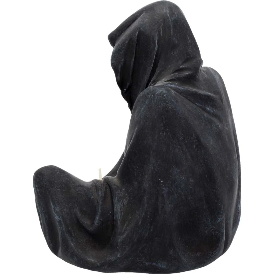 Sat on the ground, this Reaper rests silently. His black cloak drapes down, hiding his skeletal face, giving this figure a sinister aura. At the base of his cloak, a small tealight candle can be placed. Cast in the finest resin before being hand-painted, this piece would make a welcome addition to any Gothic home.