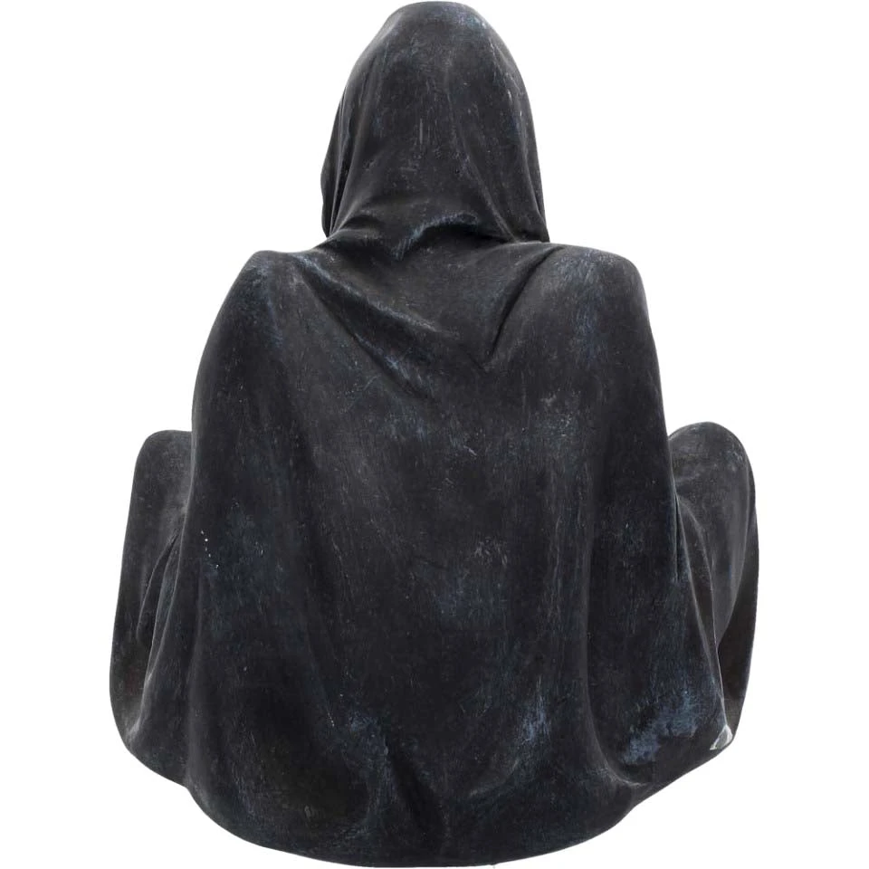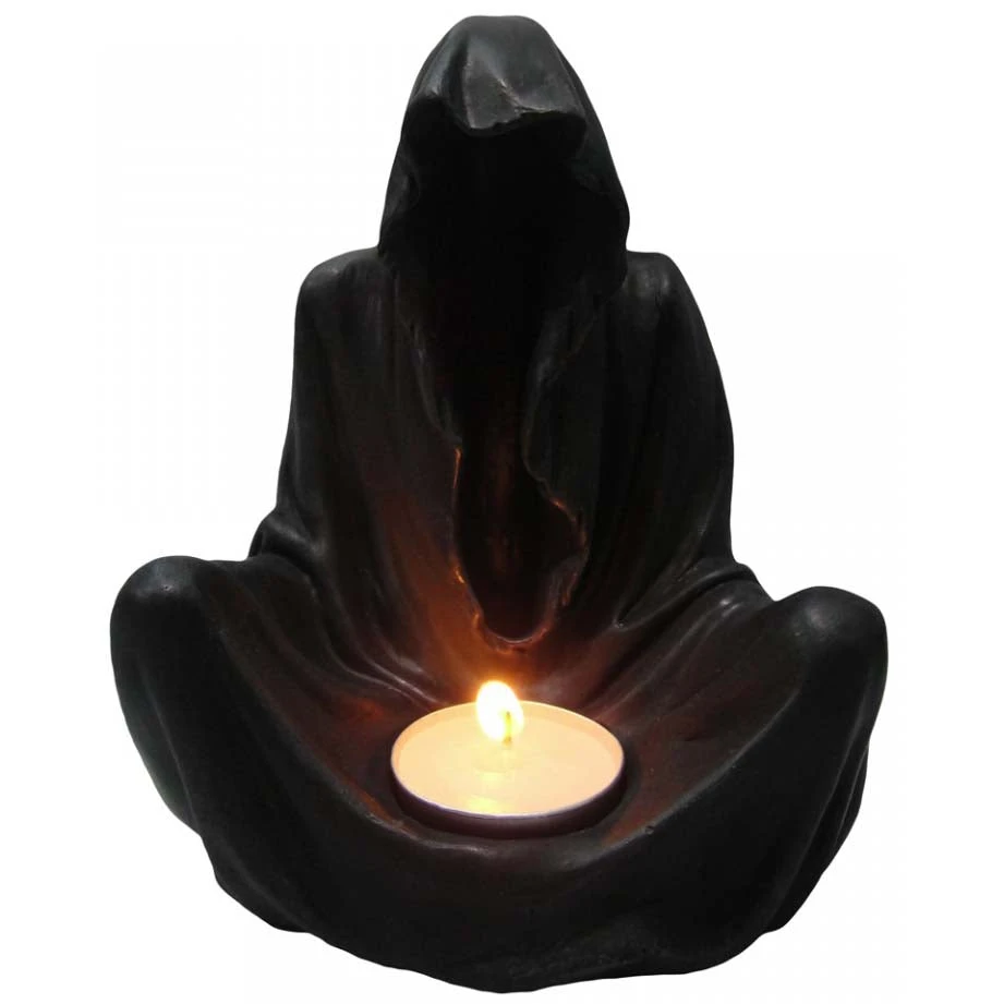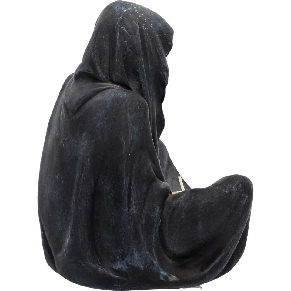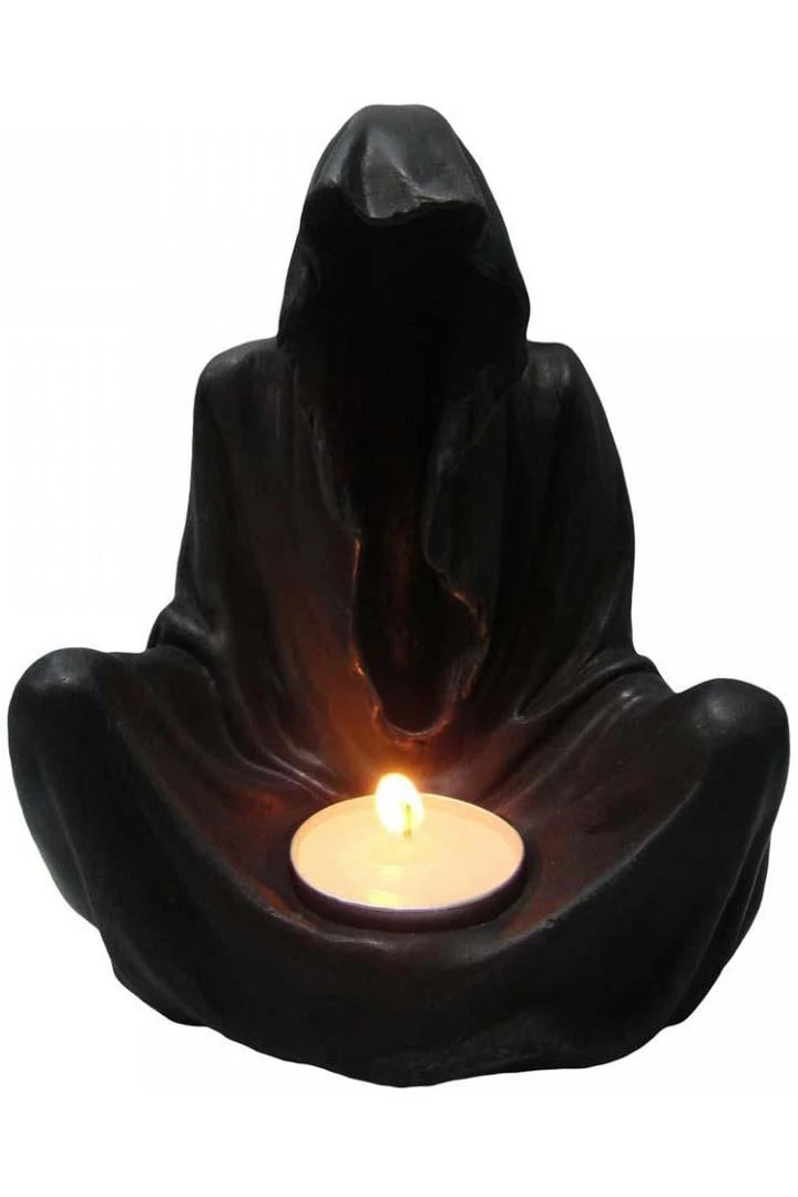 Sat on the ground, this Reaper rests silently. His black cloak drapes down, hiding his skeletal face, giving this figure a sinister aura. At the base of his cloak, a small tealight candle can be placed. Cast in the finest resin before being hand-painted, this piece would make a welcome addition to any Gothic home.