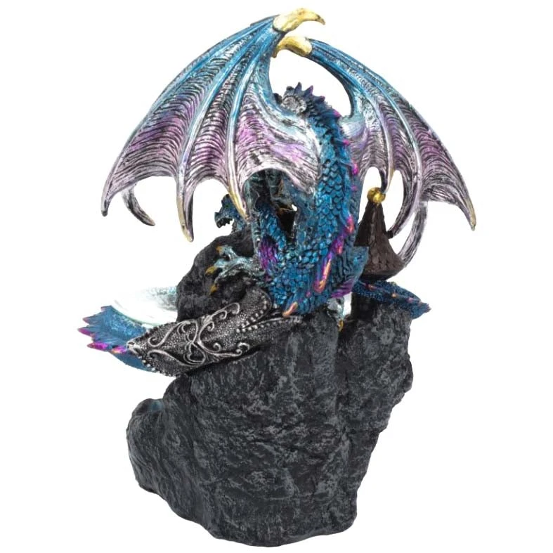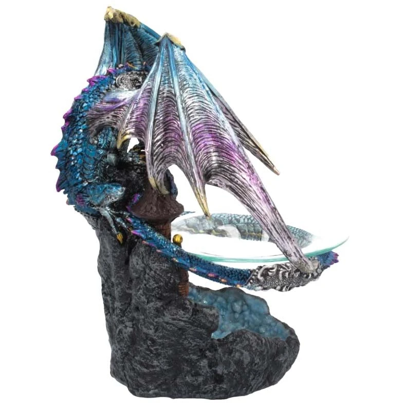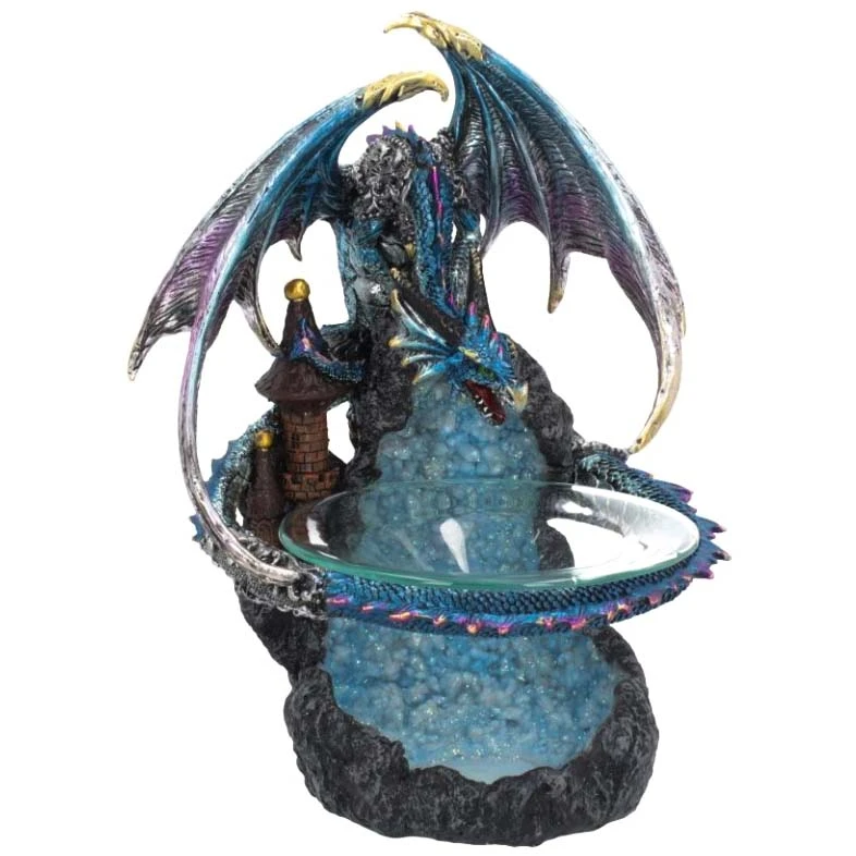 This Blue Dragon oil burner is the perfect addition to any Dragon collection. The Dragon stands atop a geode, his wings spread forward, protecting his castle. His long tail forms the holder for the oil dish which he looks down into. Cast in the finest resin before being lovingly hand-painted, this enchanting piece would look great in anyone’s Fantasy collection.