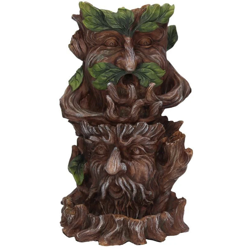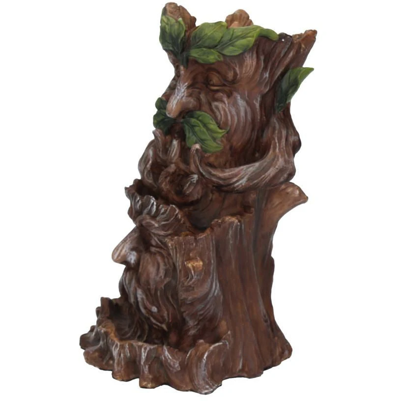 Cast in the finest resin before being painstakingly hand-painted. Stacked on top of each other, these two tree spirits are ancient and gnarled, bushy leaves and creeping roots forming thick, luxurious moustaches. The one below looks up at the antics of the one above as he puffs out his cheeks, ready to blow a thick plume of smoke. This burner is designed for backflow incense cones, made specially to produce a thicker, denser smoke which flows downwards from the open mouth of the spirits in a great cascade. Why not browse our selection here, and make sure you have a variety of scents so you can enjoy this burner to its fullest?