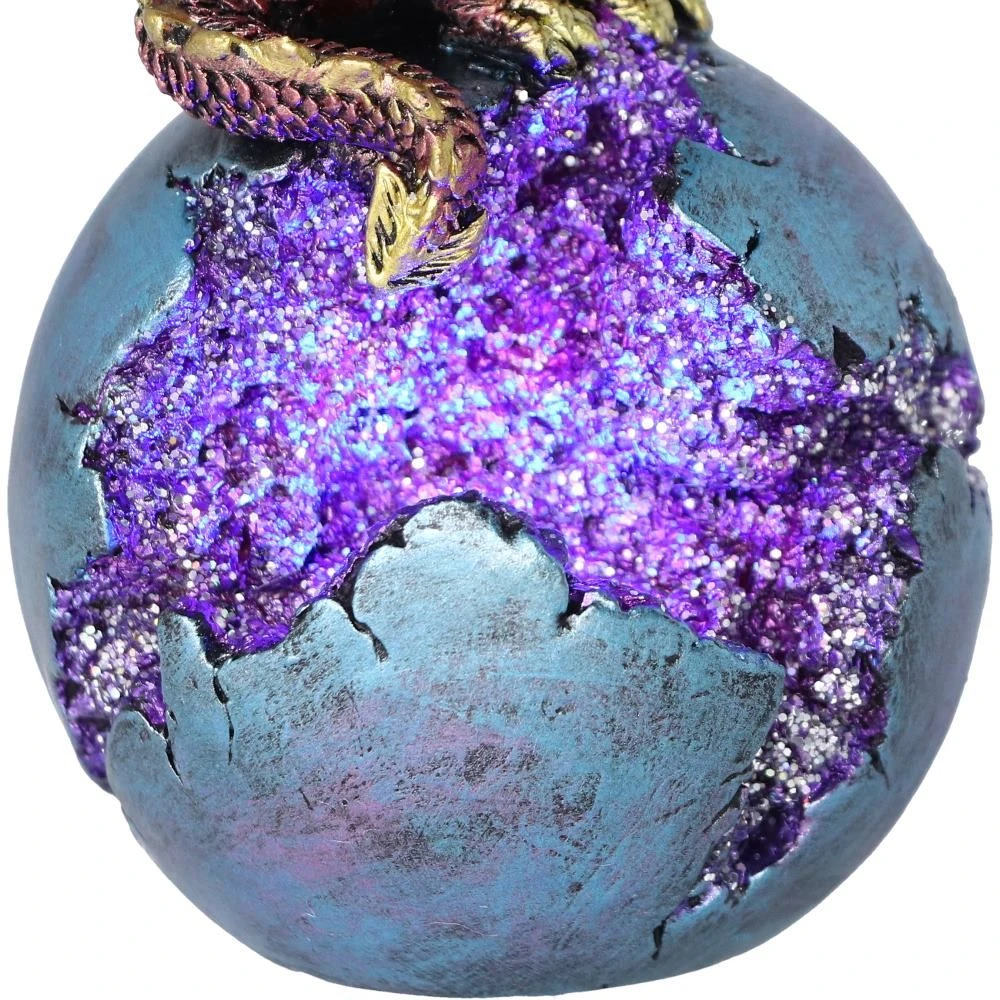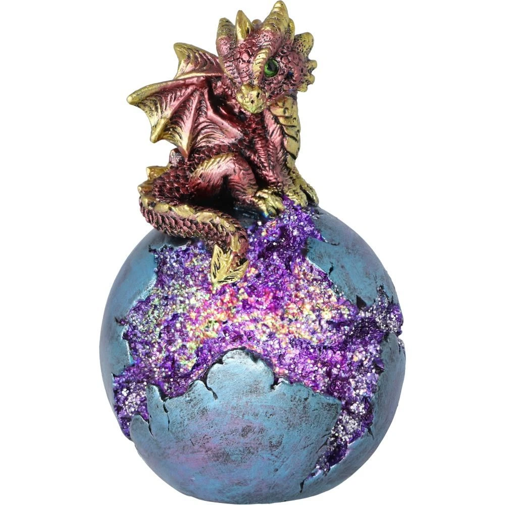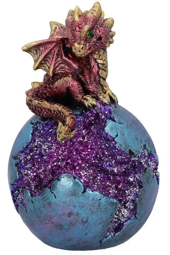 Watch as this wide-eyed creature sits atop its geode perch. Featuring bright-red scales with golden accents on their claws, horns and wings, this enchantingly adorable dragon is looking into the world from its cracked metallic purple home. Cast in the finest resin before being expertly hand-painted, this is the ideal gift for any lover of mythical beasts!