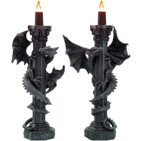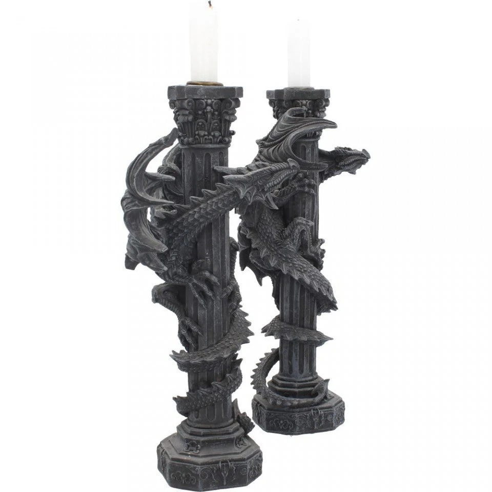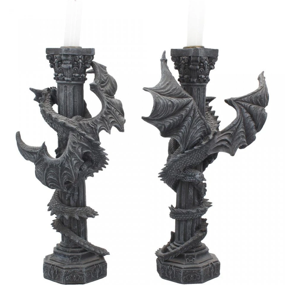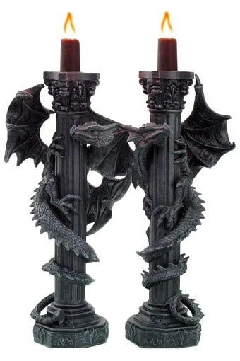 A pair of standing candlesticks. Each stick is based on a Greek/Roman pillar design, with a octagonal base, and a cylindrical body. Each stick then has a dragon wrapped around it in opposite directions; almost mirroring each other. Candles not included.
