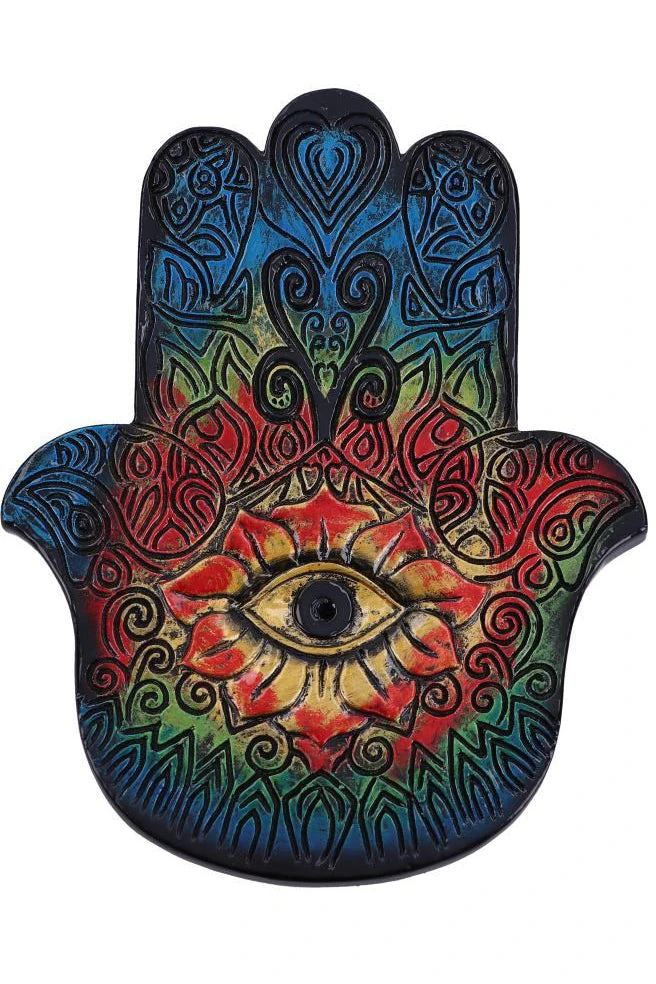 This fantastic incense holder comes in a set of four. Shaped like a human hand, this Middle Eastern symbol represents the Hand of God. It is said to bring its owner happiness, luck, health, and good fortune. In the palm of the hand, a large Eye has been carved. This represents the Evil eye and will give the keeper protection against evil forces. In the centre of the eye, there is a small hole where you can place your favourite incense sticks. Cast in the finest resin before being carefully hand-painted, this holder is perfect for anyone who needs a little protection.