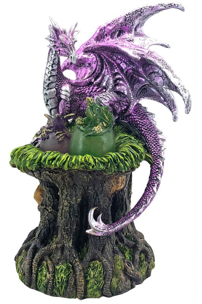 Home of the Hatchlings: This lustrous pink mother dragon lays on her nest alongside her emerging green and purple hatchlings. The nest sits atop a tree stub with the mother dragon wrapping her tail around it for support whilst providing her young protection from the elements with her raised wings. Cast in high-quality resin before being expertly hand-painted. Perfect for any proud parent, this draconic statuette is a great addition to any side table or mantelpiece.