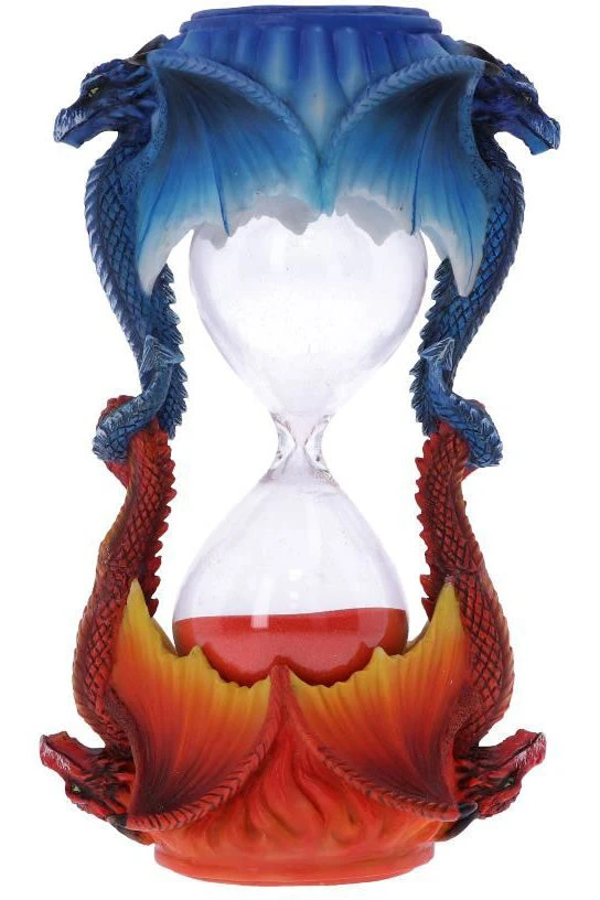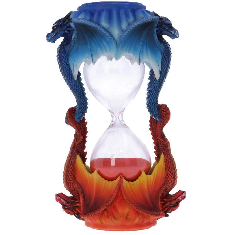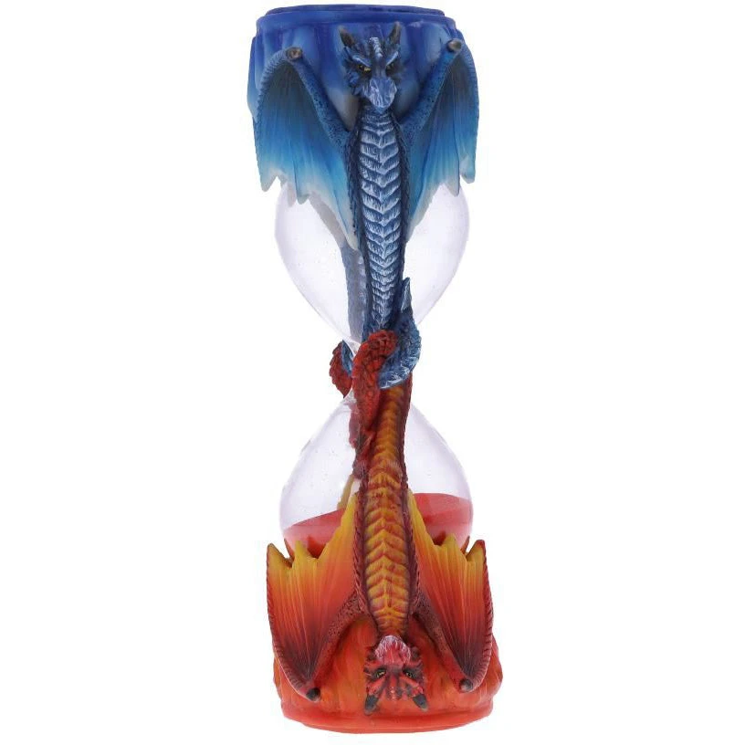 Ice Flame Sand Timer: This dragon timer shows two dragons in an eternal battle. The red dragon represents fire and the blue dragon represents ice. The two dragon tails are interlocked, holding the sand timer in place. Above the dragons are the elements that they represent, atop the red dragon are flames, above the blue dragon are long shards of ice. Filled with orange sand, this timer is a fantasy lovers dream. Cast in the finest resin before being hand-painted, this product is perfect for any Dragon enthusiast.