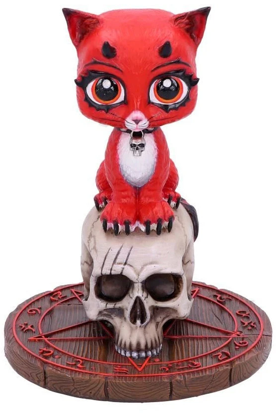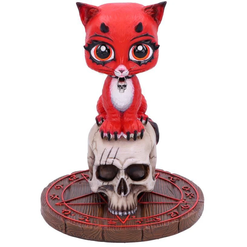 This red Cat is adorable but deadly! A small pair of horns emerge from its head making sure that we know this kitty is not just your ordinary familiar. A spiked collar sits around its neck while a set of long dark claws grip onto its cranial perch. The skull sits above an inverted pentagram base as if it has just been summoned from the nether realm. Cast in the finest resin before being lovingly hand-painted, this piece would make a fantastic gift for anyone who wants to grasp onto their dark side.