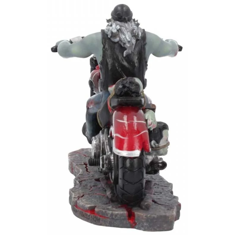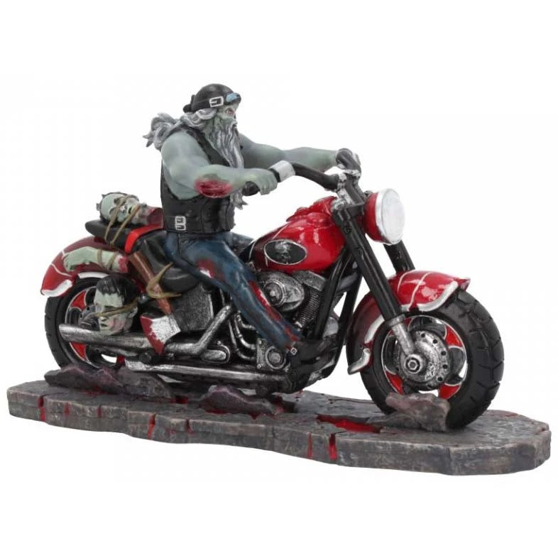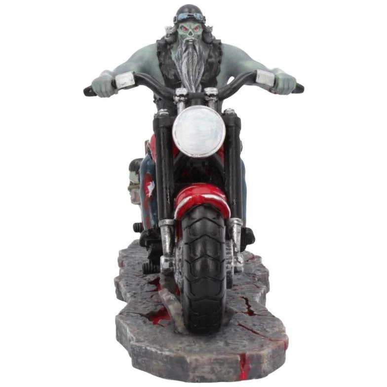 From Gothic and alternative artist James Ryman. On a deserted highway, this zombie rider accelerates towards you, wearing a leather cut and tattered jeans hanging off his undead frame. An axe and two severed heads are lashed to the side of the bike and show that the rider is ready to cut down anyone who stands in his way. The floor underneath him cracks, exposing a hellish glow as the biker grasps the handle bars. Cast in the finest resin before being carefully hand-painted, this would make the perfect addition to any Gothic collection.