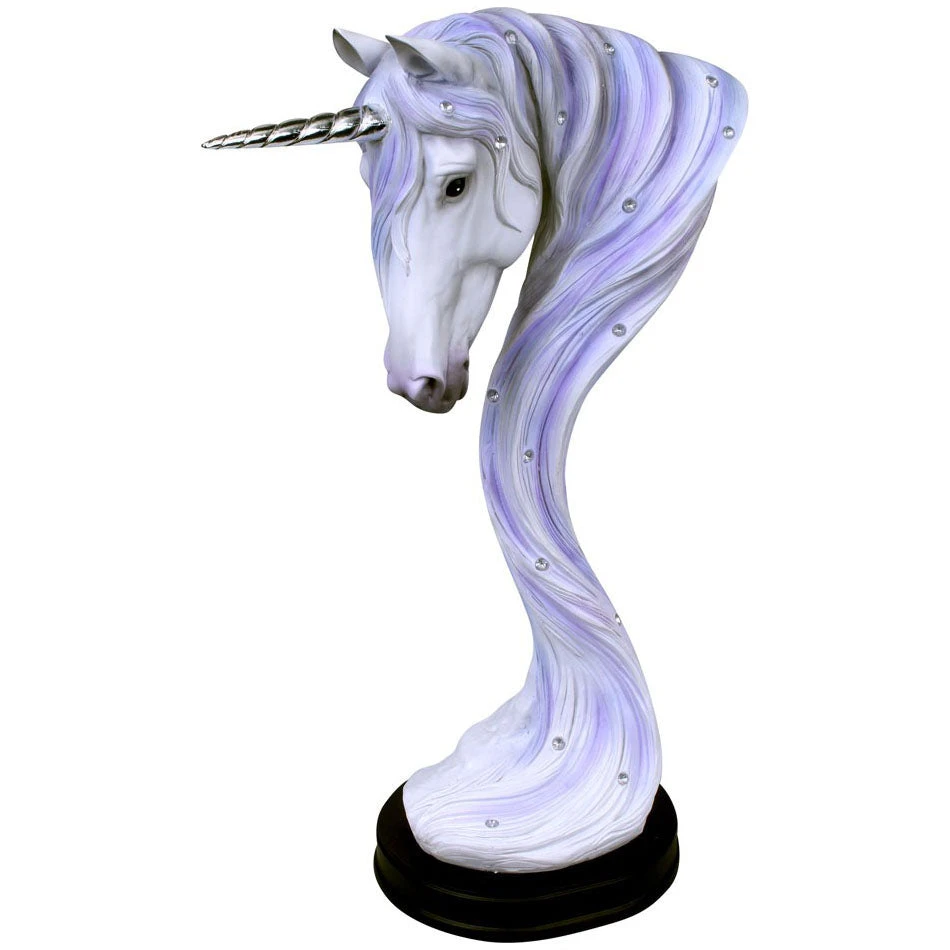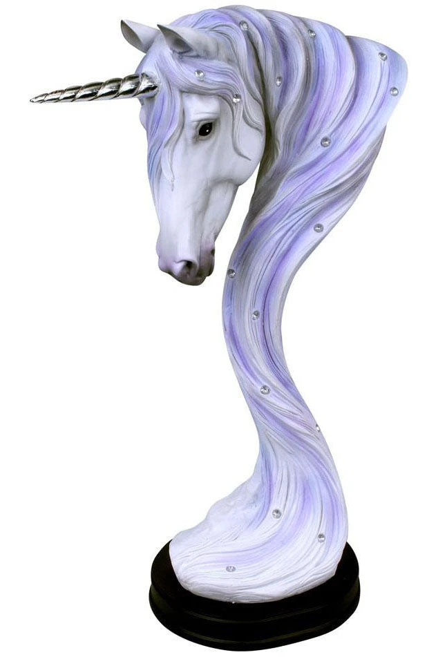 Staring ahead, this white unicorn has large, black eyes full of wisdom. The skin shades to a light violet towards the snout, and a short silver horn spirals out from ears pointed forwards. Their long white and violet mane hangs down, clear jewels scattered throughout, before pooling on a black base. Cast in high-quality resin before being painstakingly hand-painted, this enchanting unicorn statuette is a great way to decorate any coffee table or mantelpiece.