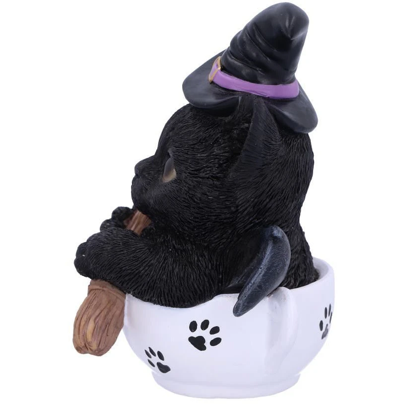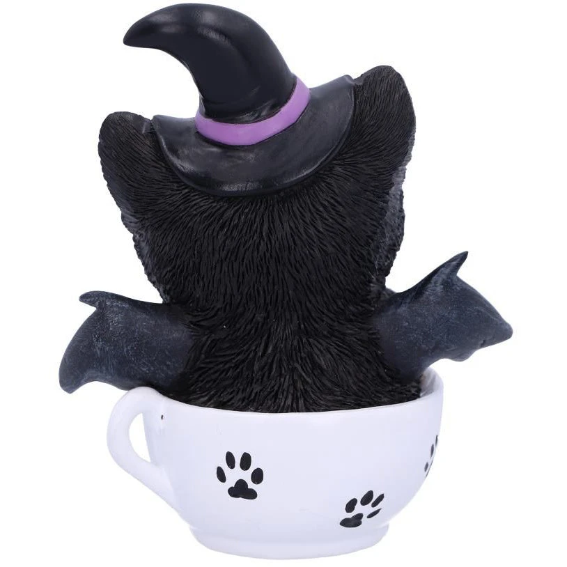 Kit-tea: Start your day off right with this wickedly delightful Kit-teacup figurine. Sitting in a white teacup, decorated in black paw prints, this mischievous black kitten has a cute little witches get-up, featuring pointed hat, broom and topped off with bat wings. Cast in the finest resin before being lovingly hand-painted, this impish Kit-tea will make a great addition to any cat-lovers collection.