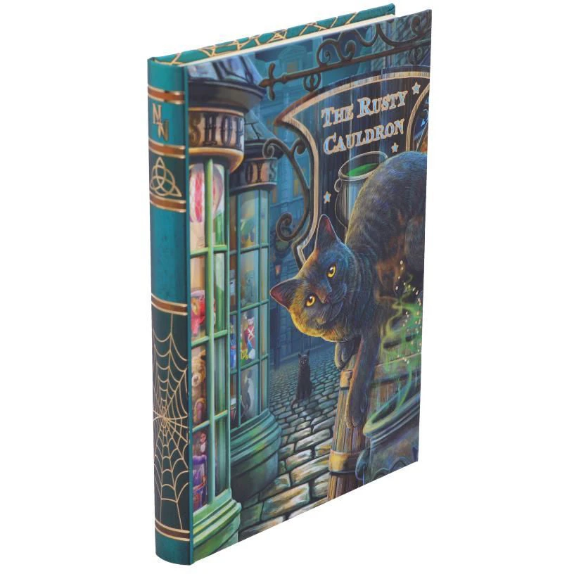 From the untamed imagination of Lisa Parker. Sat on top of a rustic barrel outside of the rust cauldron, this mystic kitty stares inquisitively at you with its piercing eyes. Whilst behind him on the cobbled road, another can be seen gazing forward, taking in its surroundings of the magical high street they find themselves on. Made of high-quality paper, this portable journal is perfect for writing down your magical adventures.