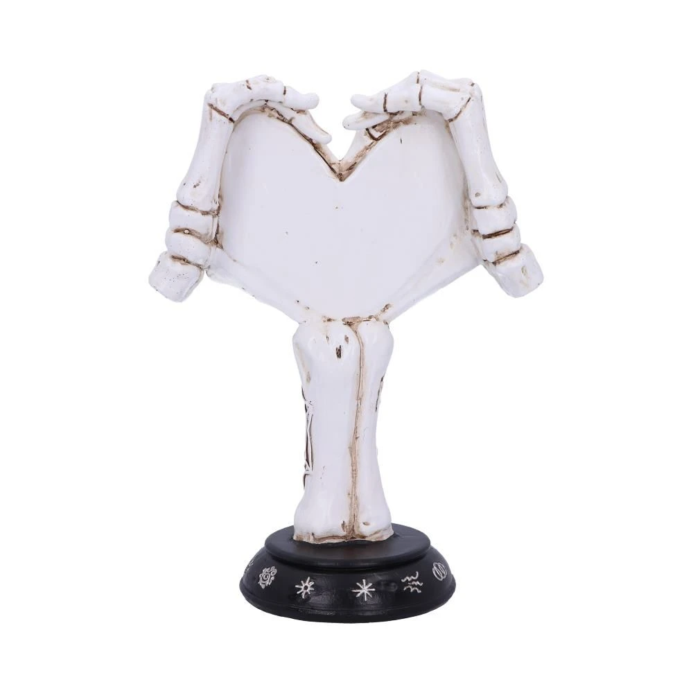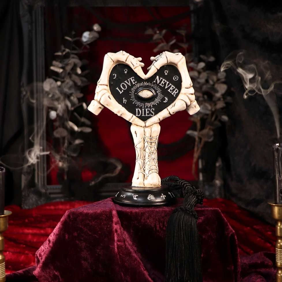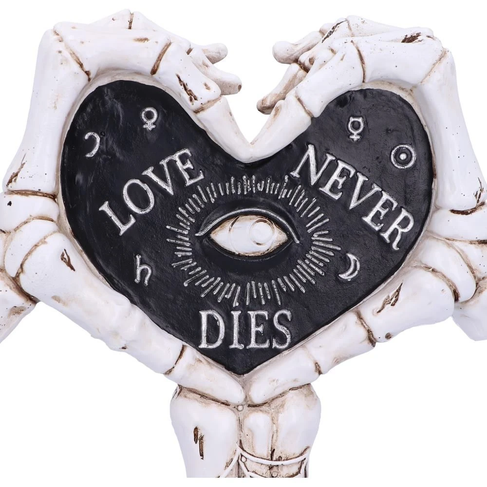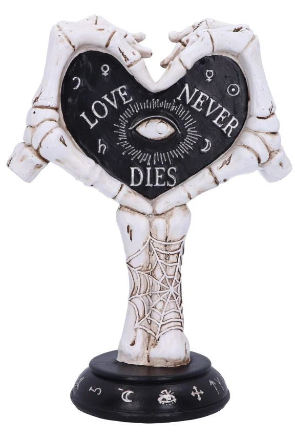 A pair of skeletal hands and disjointed ulna and radius bones appear from a black base, covered in white symbols. These detailed hands do not have an ounce of flesh, meaning that death took its grasp a very long time ago, and are decorated with a simple white web design. In the hands grasp is a black heart, emblazoned with the words ‘Love Never Dies’ and a large white eye. Cast in the finest resin, before being painstakingly hand-painted.