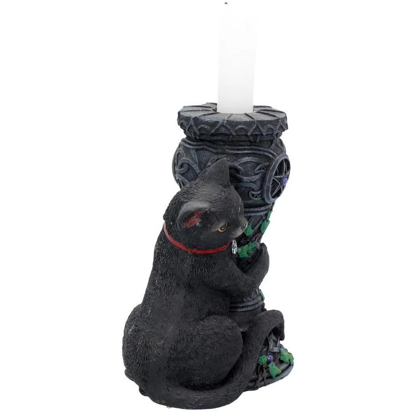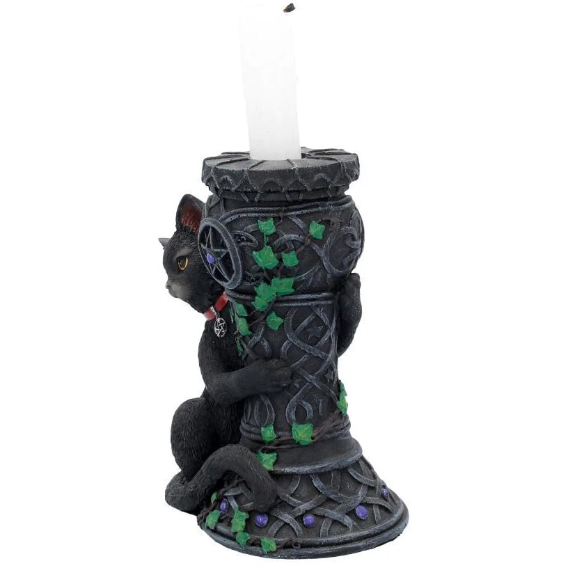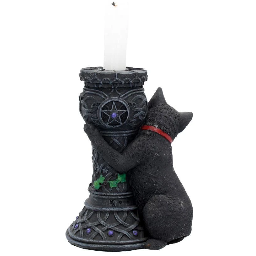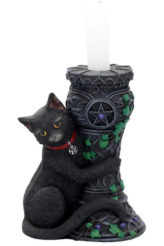 This charming cat candle holder is cast in high-quality resin before being painstakingly hand-painted. A pillar of carved grey stone rises up, curving inwards in the middle. Ivy crawls up it, creeping around the purple gems set in carved pentagrams. A hole in the top awaits your candle. A midnight black cat leans against it, hugging it. A silver pentagram medallion hangs from their red collar. A perfect gift for the charming witch in your life.