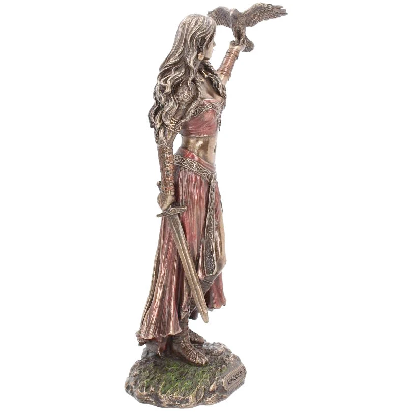 Cast in the finest resin before being given a bronze finish and carefully hand-painted. Standing on a rocky battlefield, the Morrighan, Celtic goddess of war and death, has a sword drawn, her red dress slit up to the thigh. She wears knee-high boots, and her long hair cascades over the torc around her neck. Her left hand is outstretched, and she’s looking to the raven messenger that’s just alighting. A fantastic centrepiece to any altar, this pagan statuette is a great gift for those who need inspiration to struggle through their own lives.