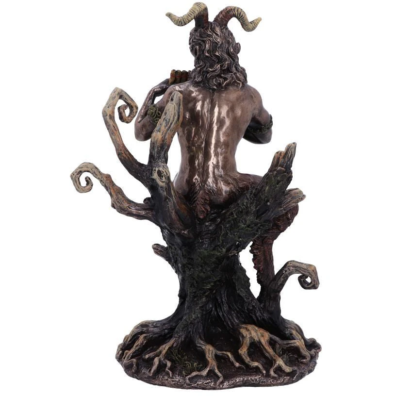 Cast in the finest resin before being given a bronzed finish. God of the wild, nature of mountain wilds, rustic music and companion of the nymphs, Pan has the torso and body of a human yet the hindquarters, legs and curved horns of a goat. Sat on a curled tree trunk, he is seen here playing a rustic melody on his symbolic pan flute.