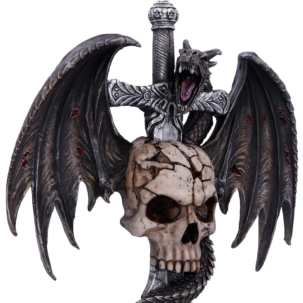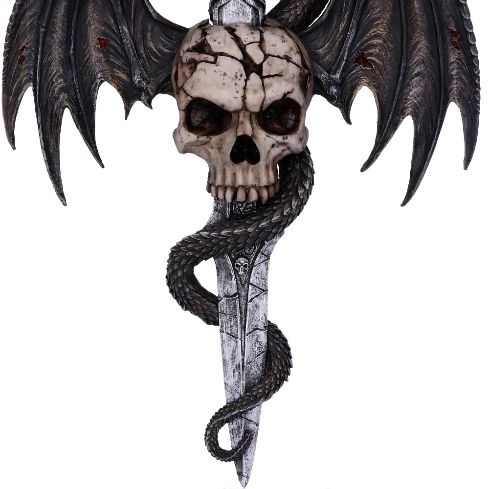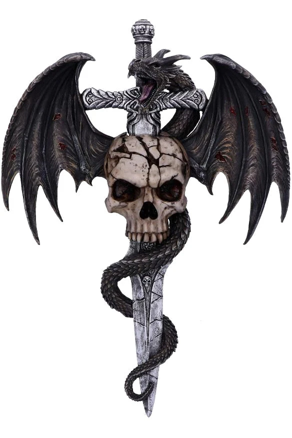 Draco Skull art transformed into a beautiful wall plaque. Featuring a wounded Dragon coiled around a menacing dagger, which finds itself impaled in a human skull, this piece is cast in high-quality polyresin and expertly hand-painted.