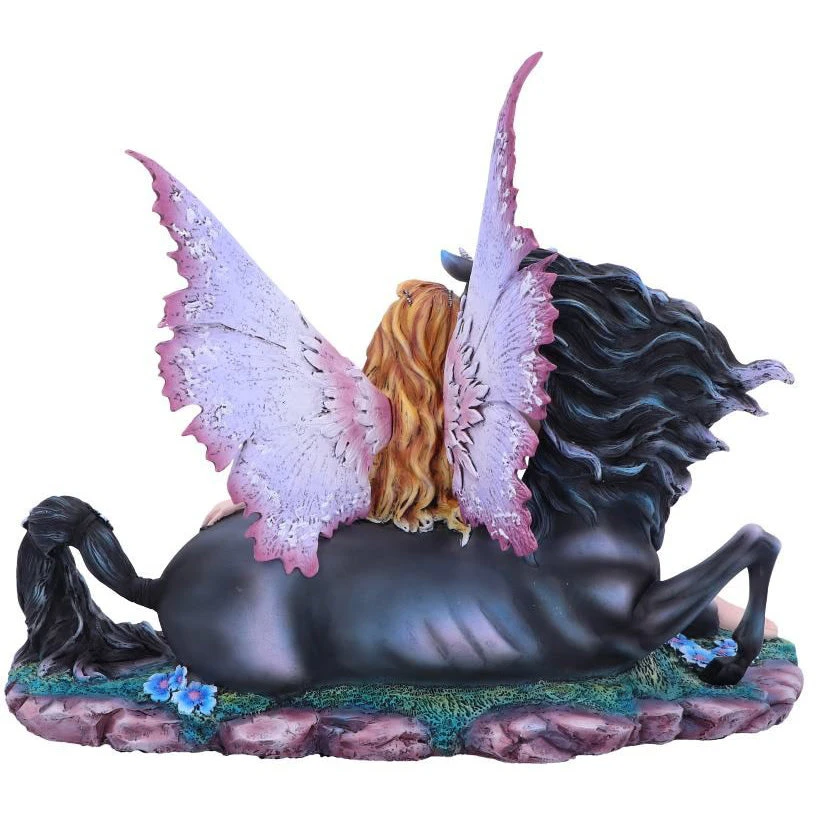 Spirit Bond Purple Pink Unicorn Fairy Companion Figurine. On moss covered rock, with blue wild flowers scattered all over, an auburn haired fairy bonds with her spirit animal. The black horse sits beside her has its tail raised and and wild flowers scattered across its mane and tail, its head rests upon the fairy’s shoulder. Wearing a loose fitting pink gown the fairy caresses the beast’s face and hind leg. Her disheveled wings are lavender and highlighted with pink. Cast in the finest resin before being carefully hand-painted, this statuette is fitting for any lover of spirit guides.