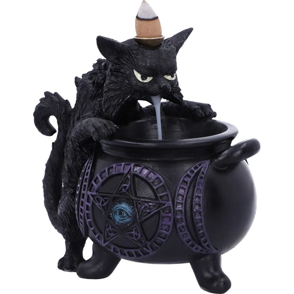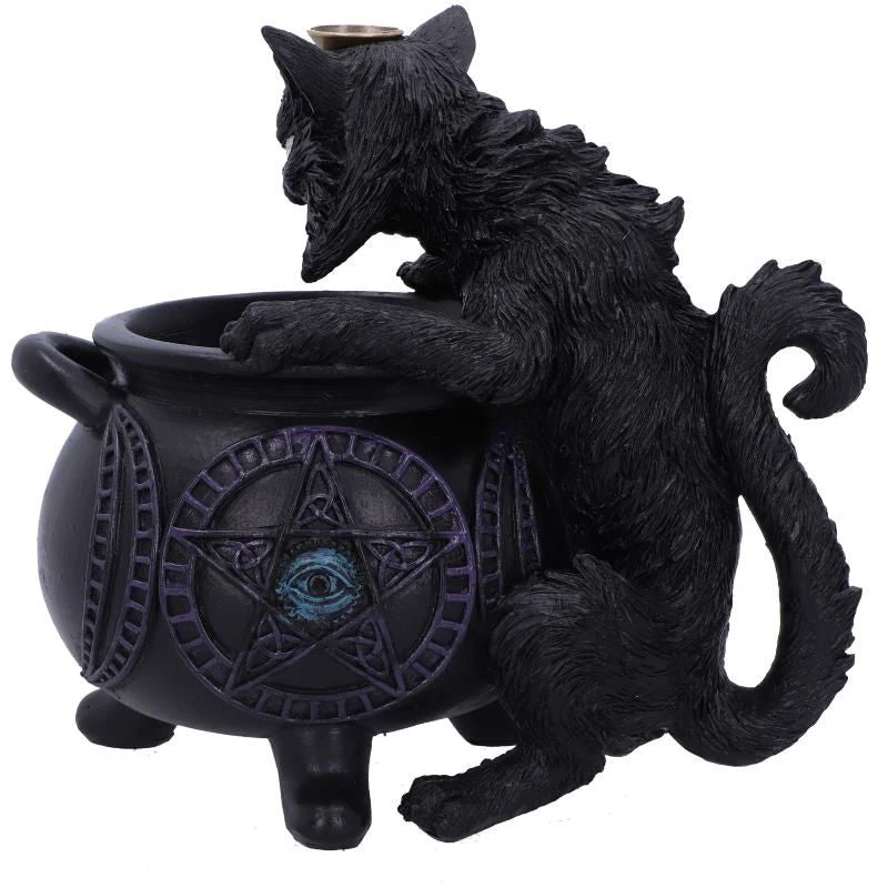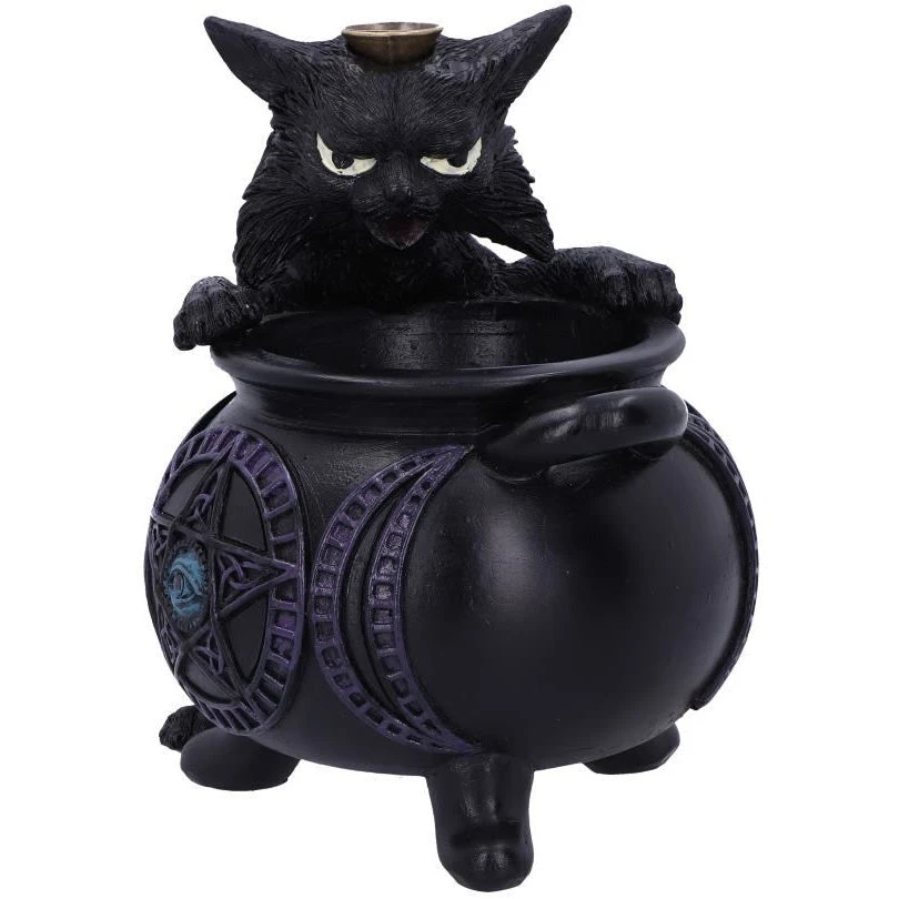 This cat looks thoroughly unimpressed! His fur is scruffy as he hunches over his companion’s cauldron, contemplating life. Being a witches familiar is a rough job, and Spite certainly shows it! On his head sits a backflow incense cone dish, ready to use with your favourite scent. Cast in the finest resin before being carefully hand-painted, this piece would make the perfect gift for any Witch in need of a companion!
