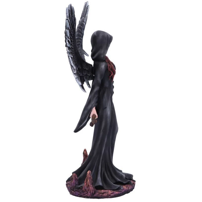 Take My Soul: This fallen angel stands upright with her wings raised high above her head, as she gasps onto the scythe behind her back. The Grim Reaper’s signature cloak is fitted tightly to the angels physique, draping down her legs and cascading onto the red rock below. The angels hair is a fiery red, the same colour as the tip of her wings. Cast in the finest resin before being carefully hand-painted, this statuette is fitting for any lover of the demonic.