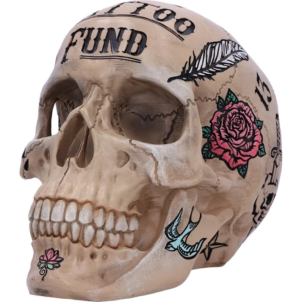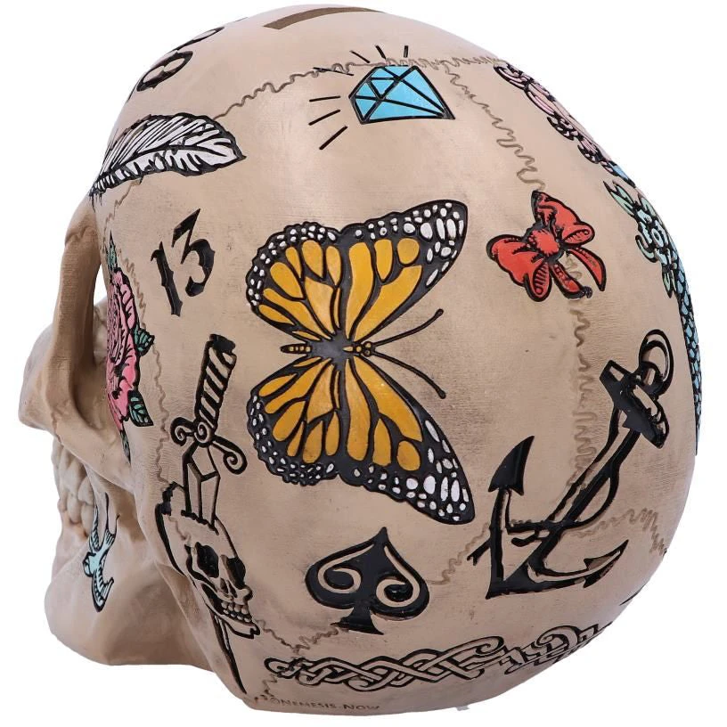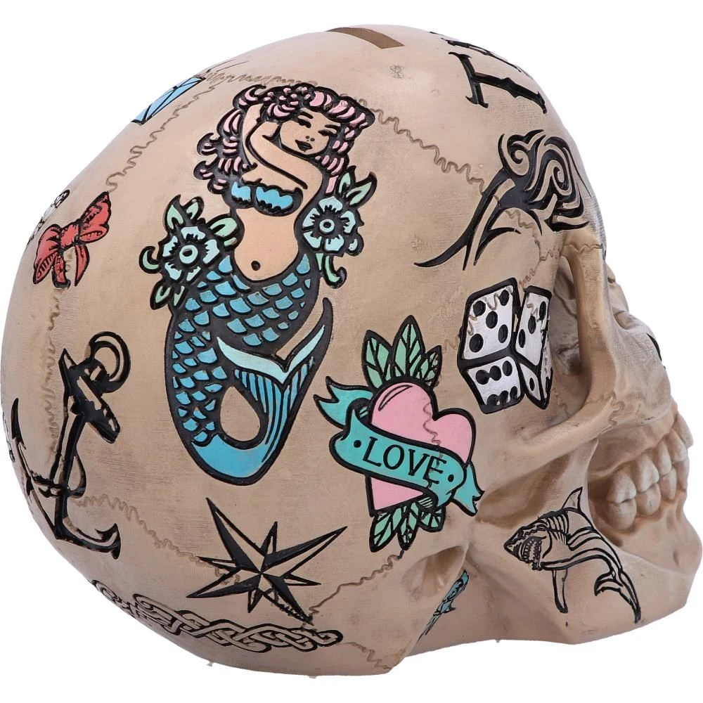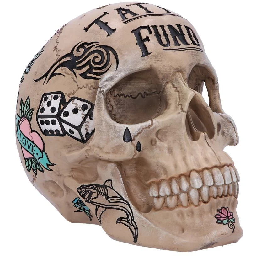 Tattoo Fund (Bone): This natural skull money box is decorated in a variety of tattoo styles including traditional, tribal and illustrative. The tattoos are painted in a colours, in contrast with the natural coloured skull. Whether you’re saving up for a tattoo or preparing for a rainy day, this skull shaped money box is the best place to store your spare change. Cast in the finest resin before being meticulously hand-painted, this piece is the perfect addition to any alternative home.