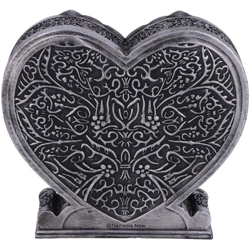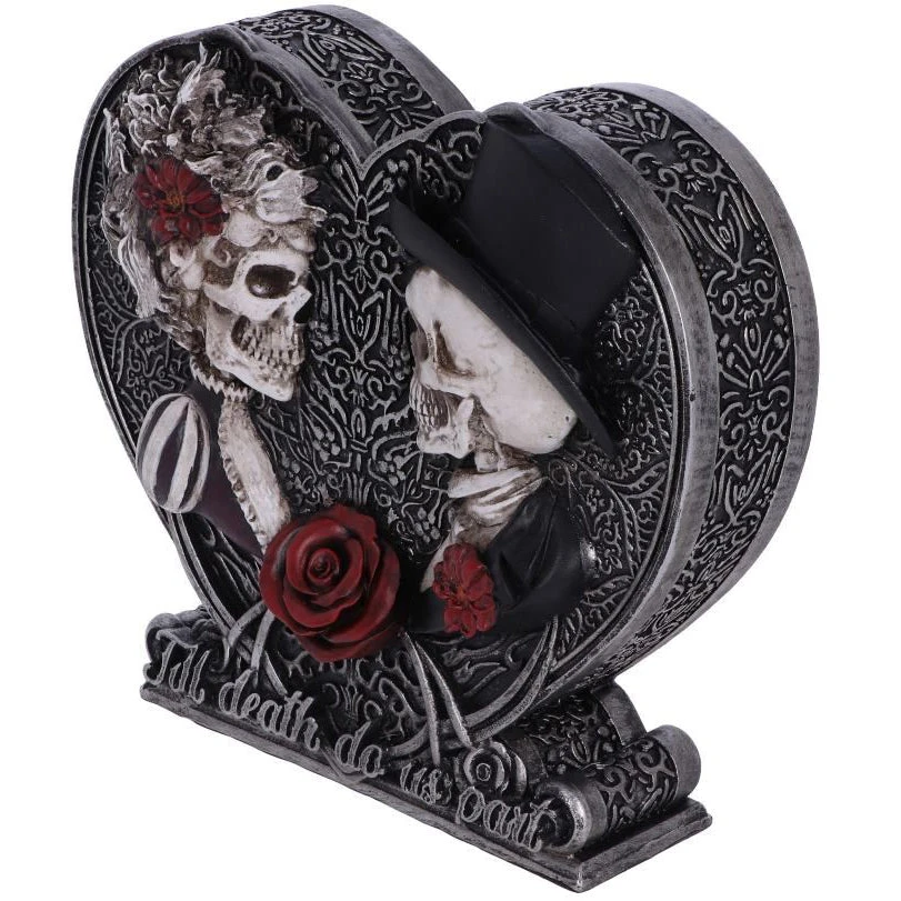 This love heart shaped money box features both bride and groom skeletons staring deeply into each other’s souls with added scarlet red roses. Cast in high-quality resin before being expertly hand-painted, this Till Death Do Us Part Money Box will be sure to keep all your cash safe.