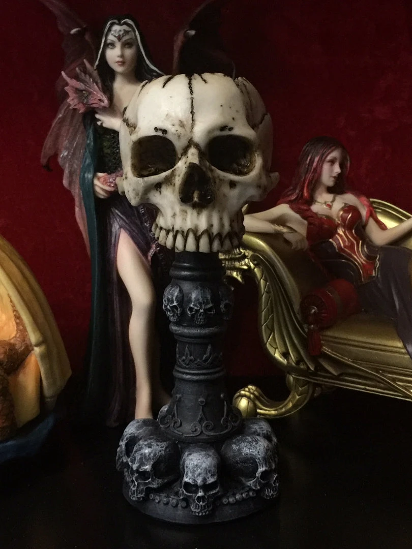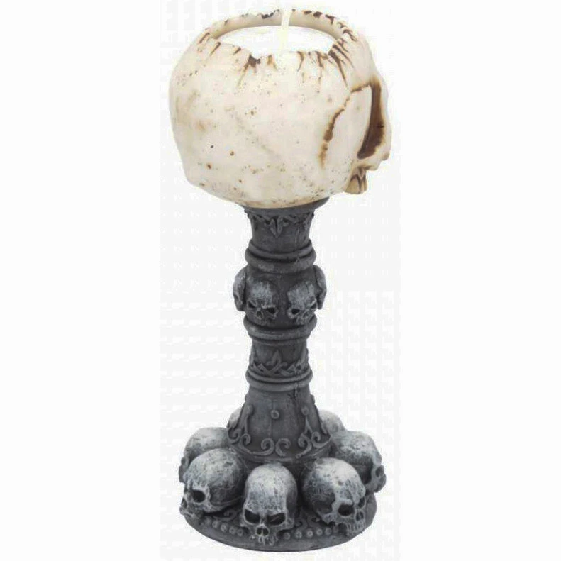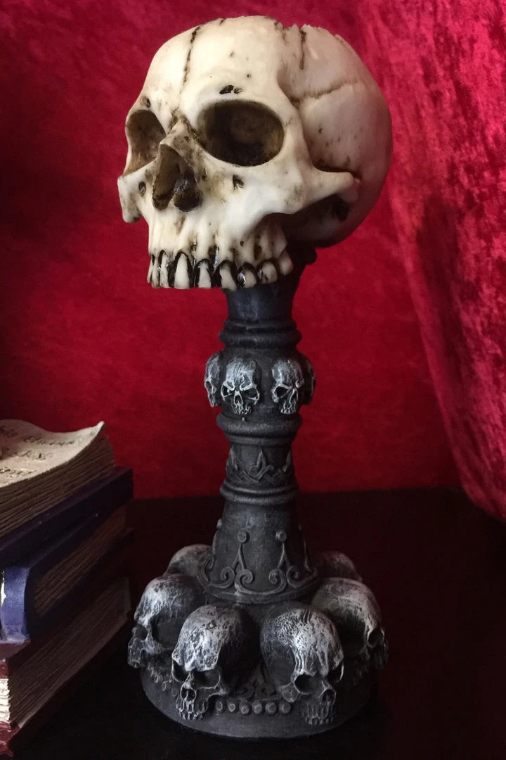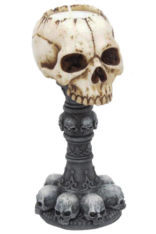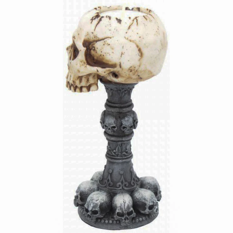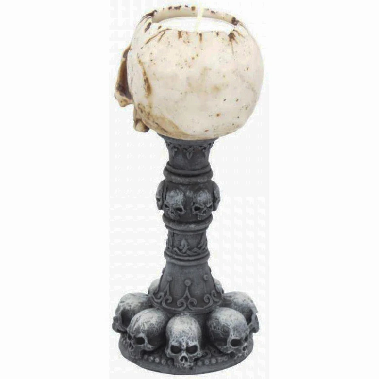Light a candle to the Gods of Death with this beautifully Gothic Tealight Holder. An aged skull sits above an embellished stem. The top of his cranium is cut off to make enough room to securely fit a tealight. Moving down, there are circular intervals that split the stem. Some plain, some decorated with intricate, Baroque designs and some adorning small skulls, adding to the macabre look. Cast in the finest resin before being painstakingly hand-painted, this piece would be the perfect addition to any Gothic home.