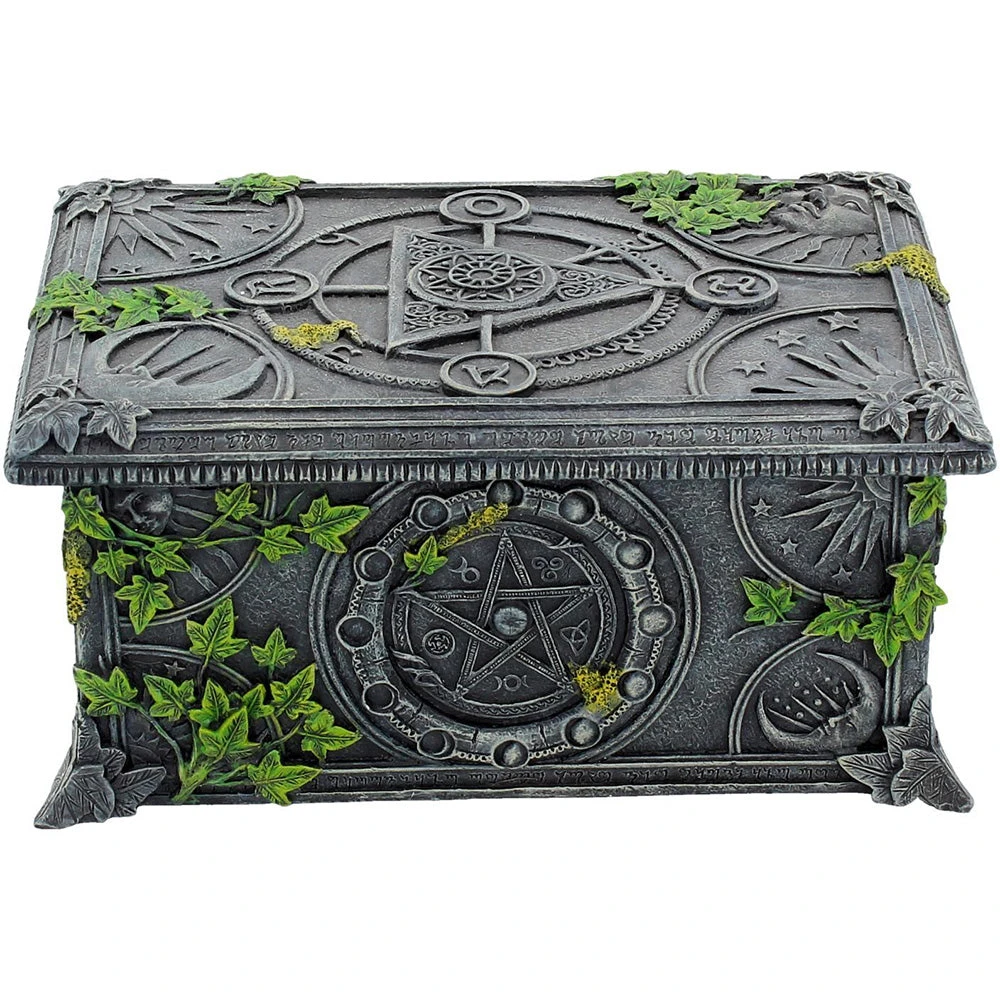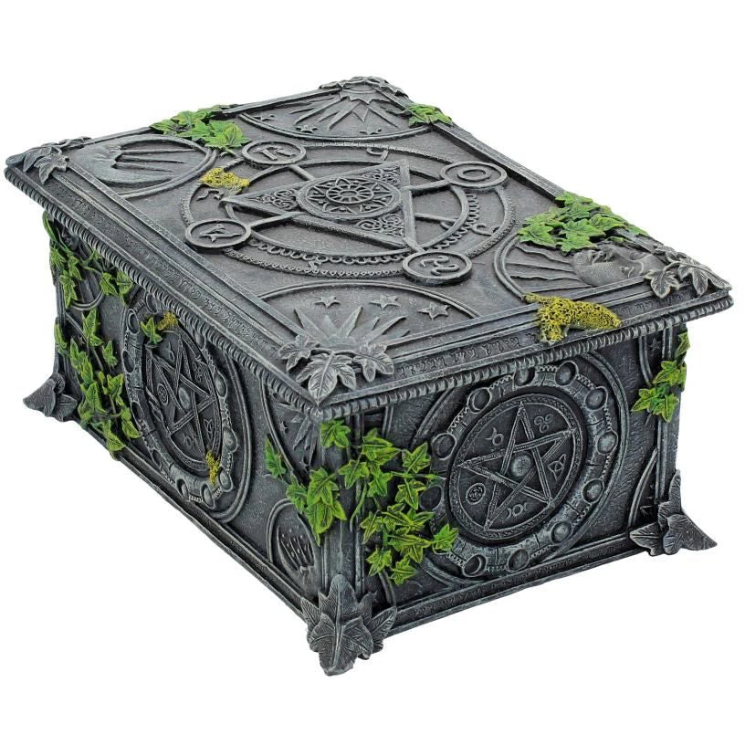This box is a fantastic gift for those in your life with the power of fortune telling. Each side has a pentagram at the centre, surrounded by astrological symbols and the phases of the moon, with the sun and moon emblazoned in the corners, while the top has an alchemical symbol of power, also surrounded by celestial orbs. Alchemical symbols border the rim, while ivy and lichen creep over the whole, giving it the appearance of an ancient stone altar in the depths of a magical Fantasy forest. Spacious enough to comfortably hold your favourite deck of tarot cards, this piece is perfect for setting the mood for any reading, adding to the already mystically charged atmosphere.