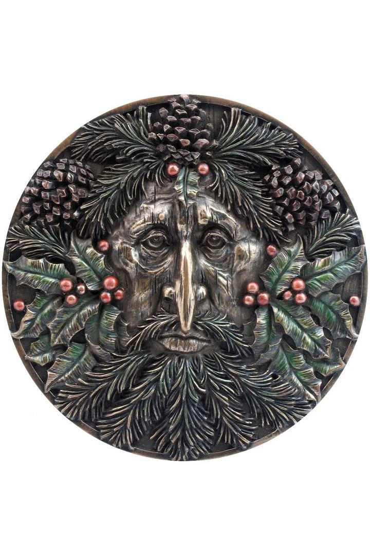 This beautiful round pagan wall plaque in bronze tone resin is moulded to look like the face of tree spirit carved in wood, peering out from amid holly, pine cones and winter foliage. The Plaque has a soft flocked backing and a fixing on the back to hang it on a wall.
