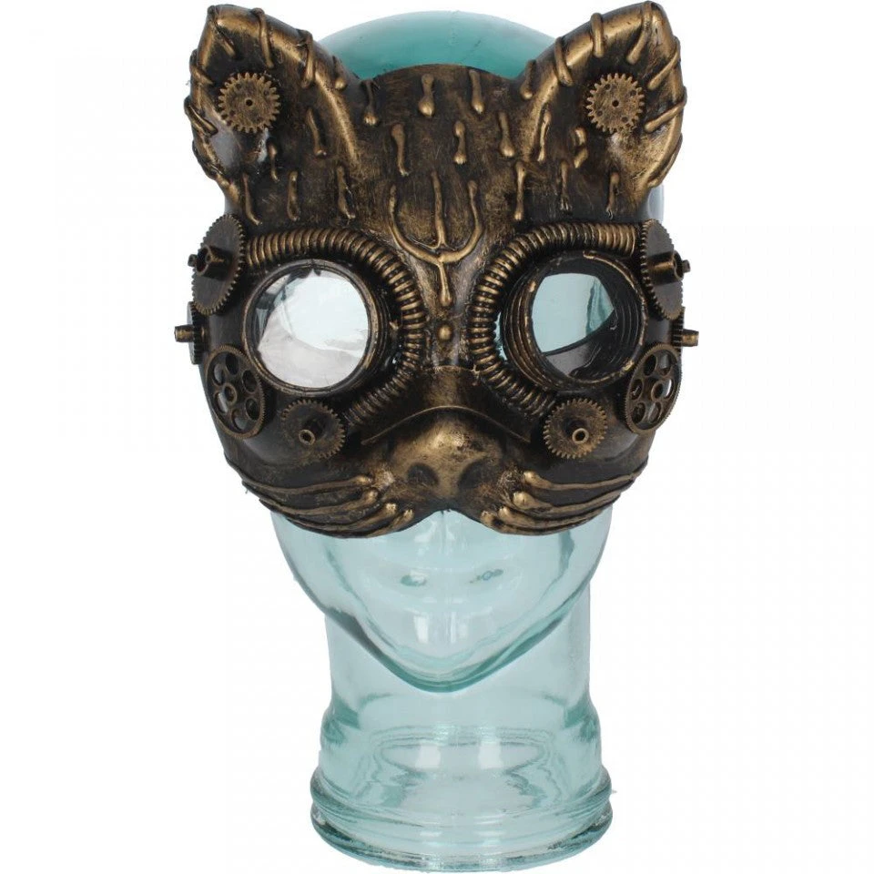 Hide your identity in style with this alternative Steampunk cat mask. This Gothic mask has a series of gears and pipes across it, seemingly a part of some mysterious unfathomable mechanism. Thick lines of soldered metal cover the top of the mask and below the nose to replicate fur and whiskers, while the large eyes have a small gear detail.