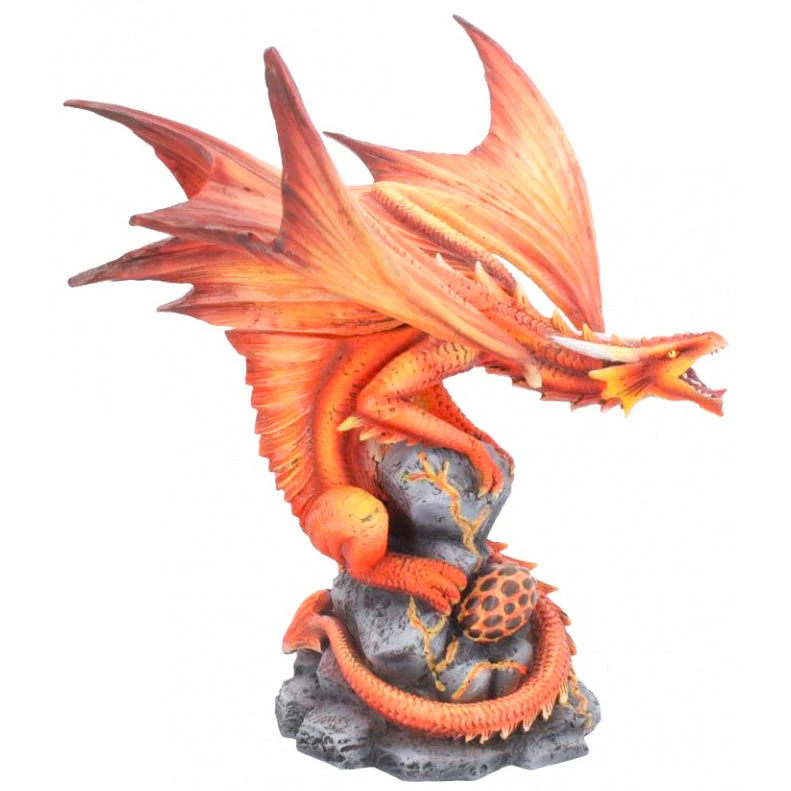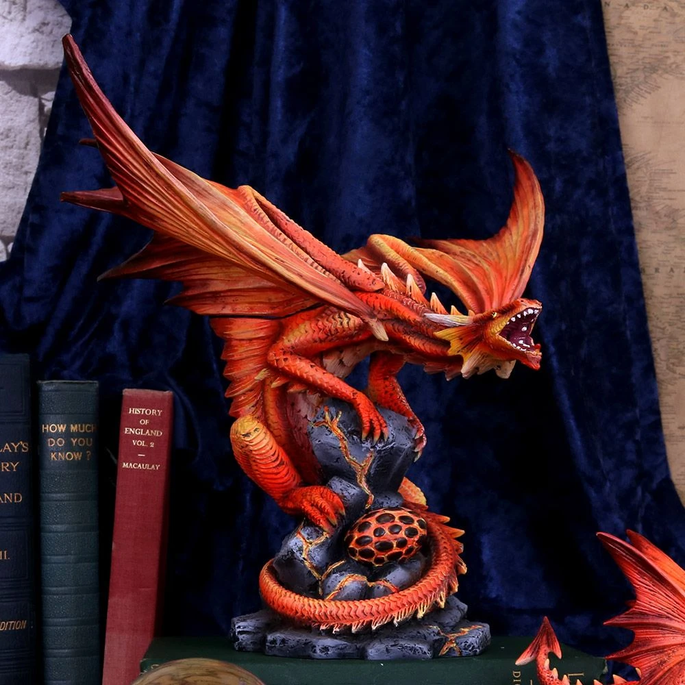 From Gothic and Fantasy artist Anne Stokes comes the Age of Dragons range. The figurine depicts the adult Fire Dragon stood atop a molten rock formation. Her wings are raised behind her, making it easy to define the ombre red and orange scales that cover her body. A small egg rests on the rock and resembles lava rock and is said to be very hot. Cast in the finest resin before being hand-painted, this product is perfect for any Dragon enthusiast.