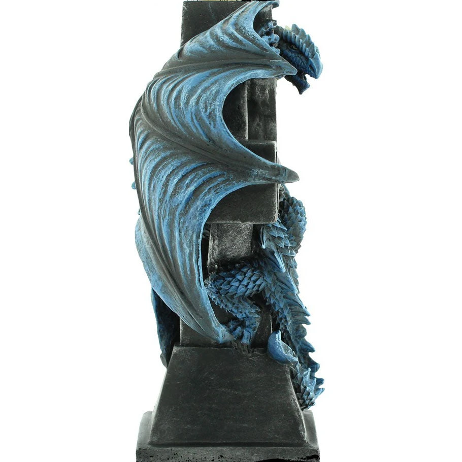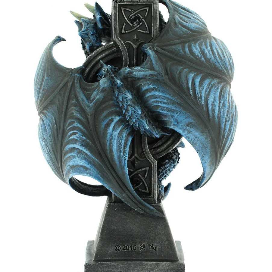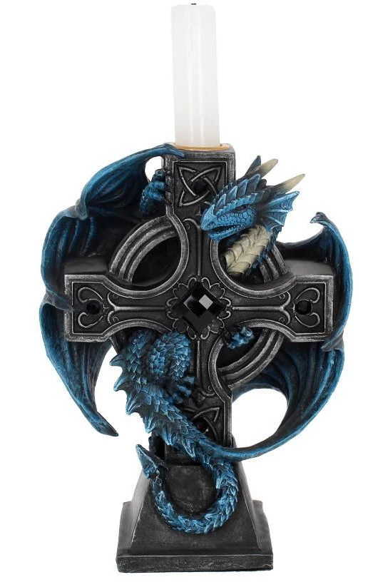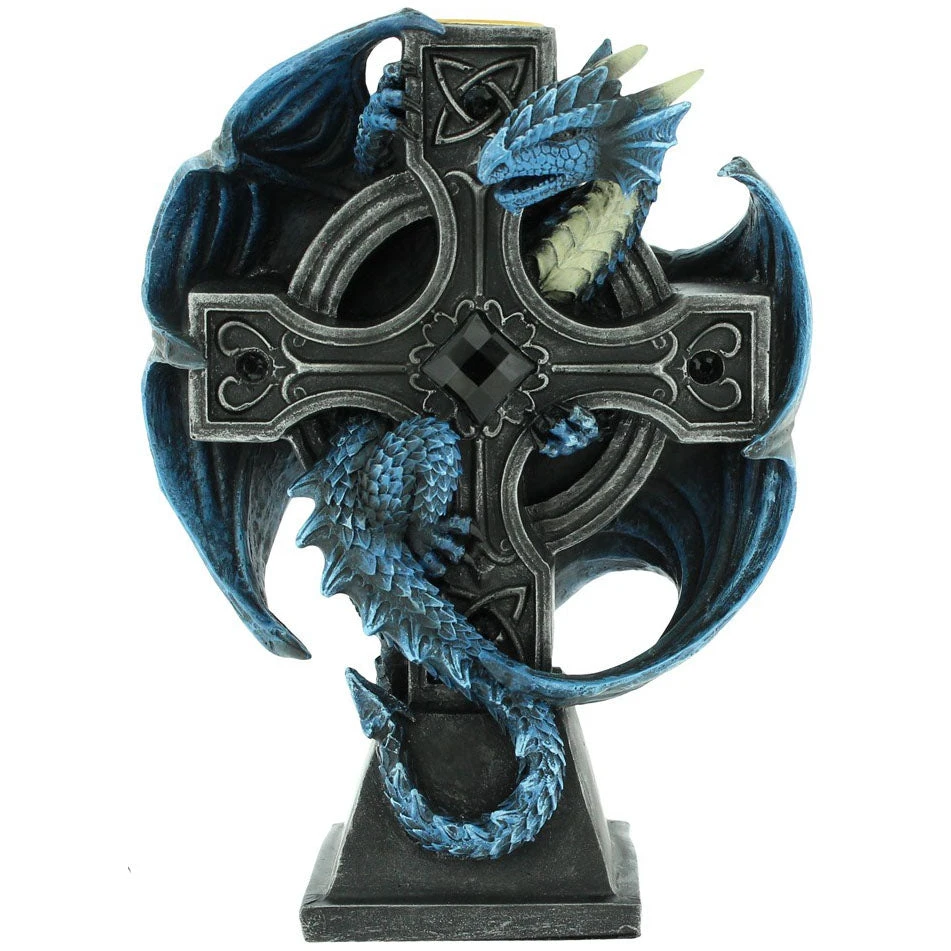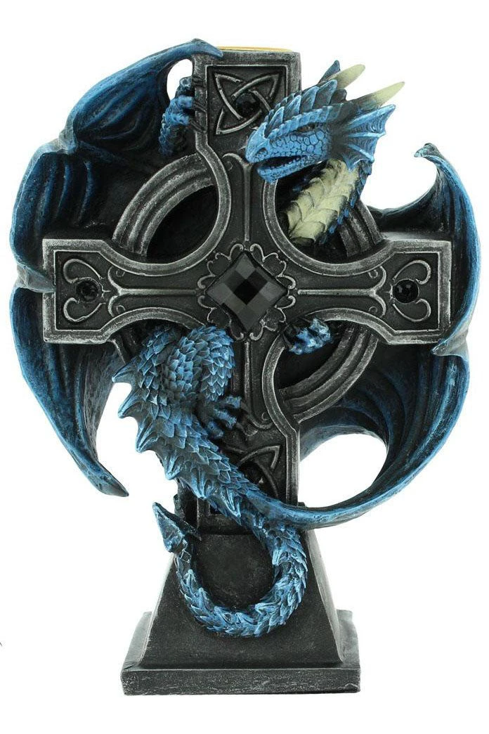 this Gothic Dragon clock comes from the Gothic imagination of globally famous alternative Fantasy artist Anne Stokes. With Celtic knot and intricate designs inlaid with black jewels, this black Celtic cross makes the perfect resting place for our fiery companion. Clinging to the back of the cross, this blue Dragon has its wings and head raised, alert to any intruders or would-be thieves. At the top of the cross there is a small space to place a candle. Cast in the finest resin before being carefully hand-painted, this piece is a fantastic way to light your way through Gothic fantasies.