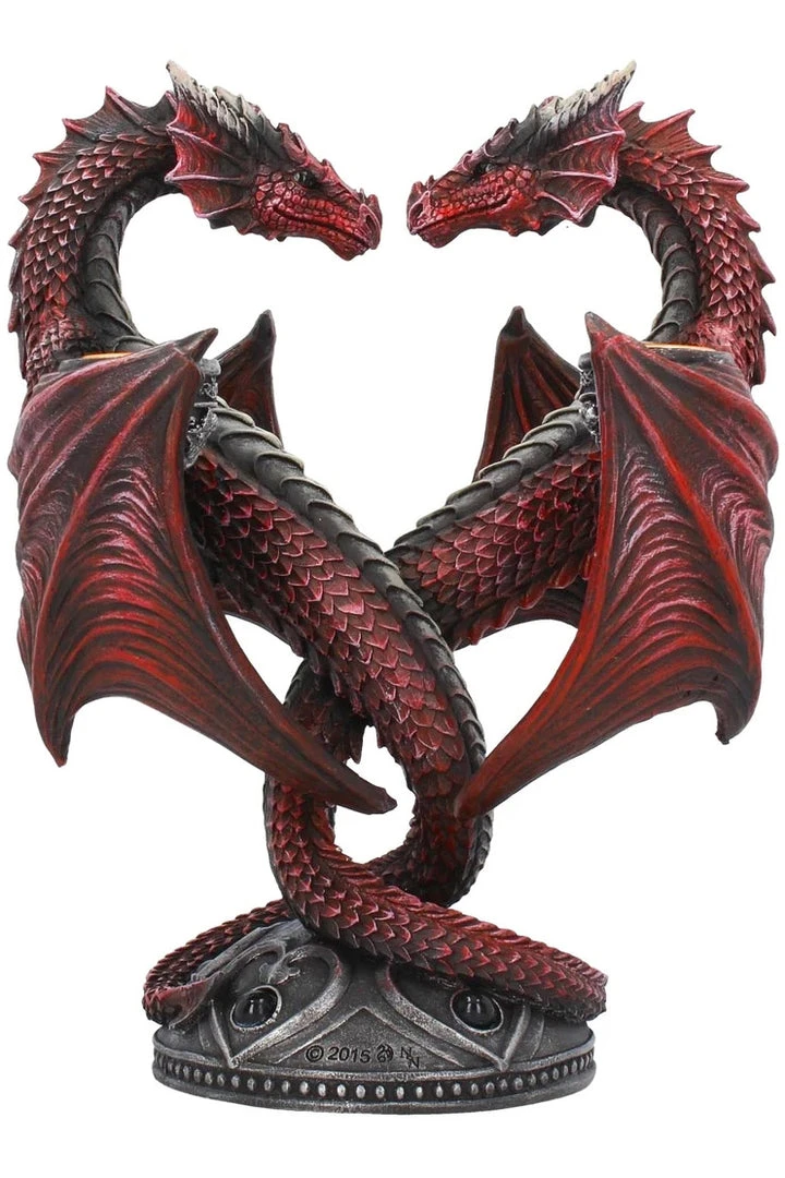 Dragons can be romantic too! From world-famous dark fantasy artist Anne Stokes. Rising from a black base ringed with onyx gems set in carved hearts, these two crimson dragons stand on their intertwined tails. Wings stretched towards each other, they gaze lovingly into each other’s eyes, the curve of their necks forming a love heart. Cast in the finest resin before being painstakingly hand-painted, this alternative dragon candle holder is perfect for illuminating a romantic dinner.