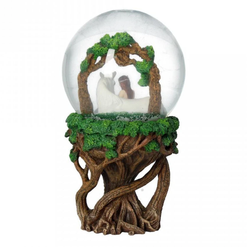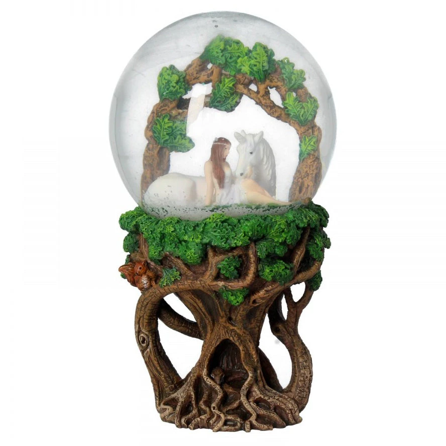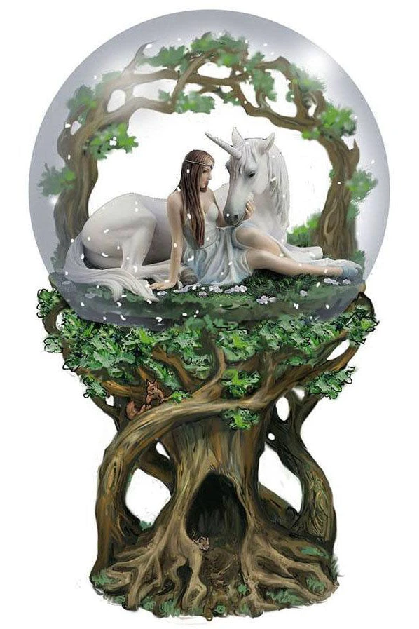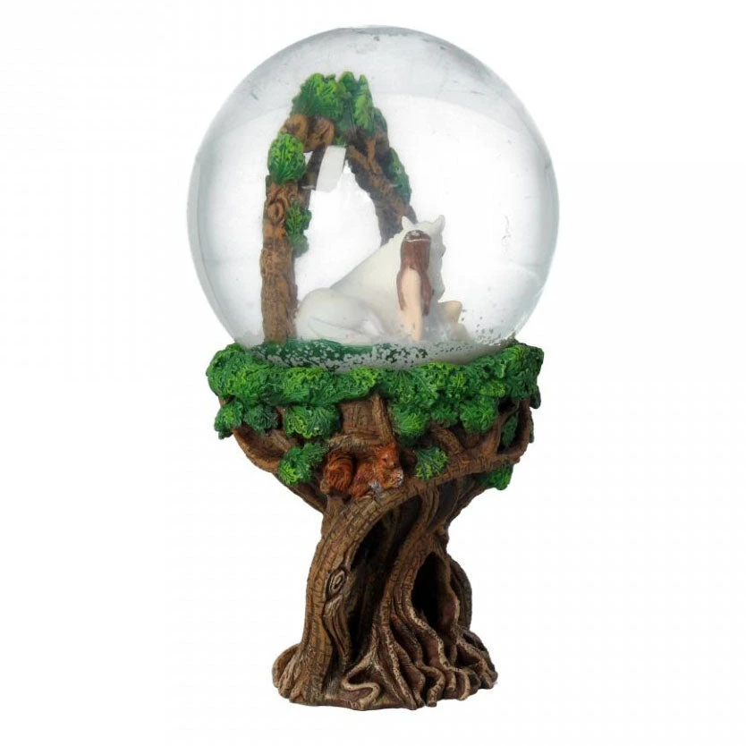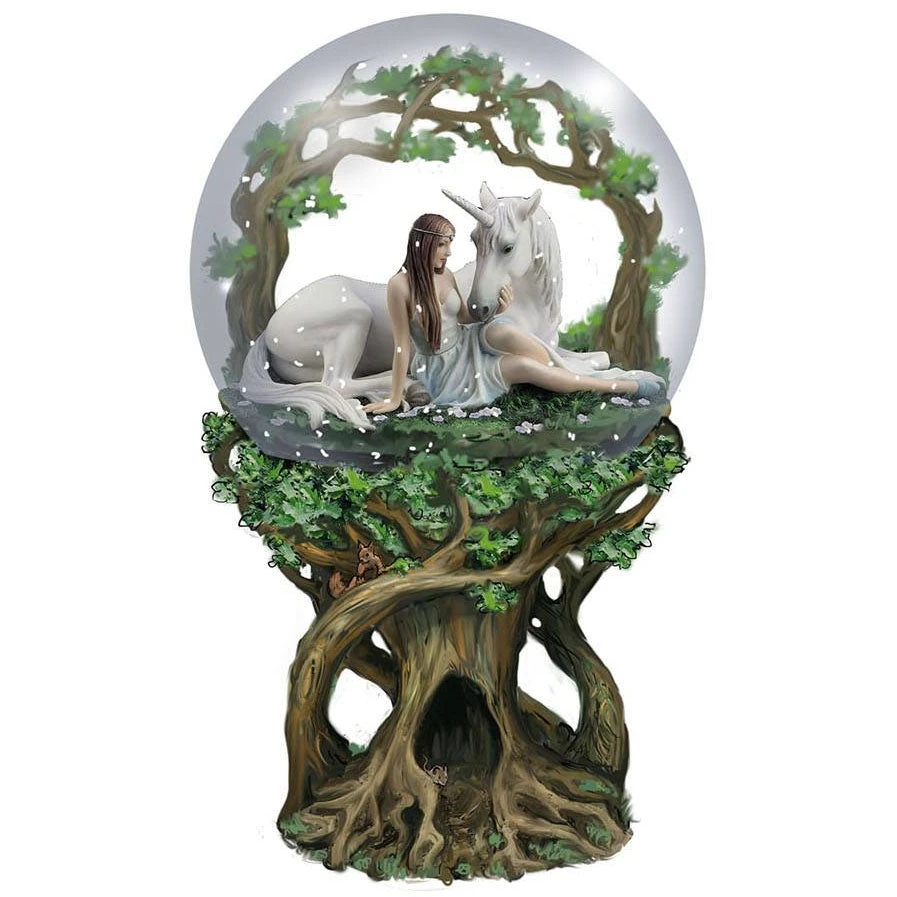 Peer into a world of magic and mystery with the Pure Heart Snow Globe, exclusive to Nemesis Now and enchanted by the imagination of world-famous Fantasy artist Anne Stokes. Beneath the hanging branches of an oak tree, sunlight streaming onto the long soft grass around them, a woman and a Unicorn lie, staring at each other lovingly. The white of her flowing white dress is as pure as the white of the Unicorn and the small wildflowers surrounding them. Around her head, a small cord keeps a jewel in place on her forehead. Standing on a sacred oak, a swirl of white snowflakes fills the globe when shaken, changing the scene within from summer to winter.