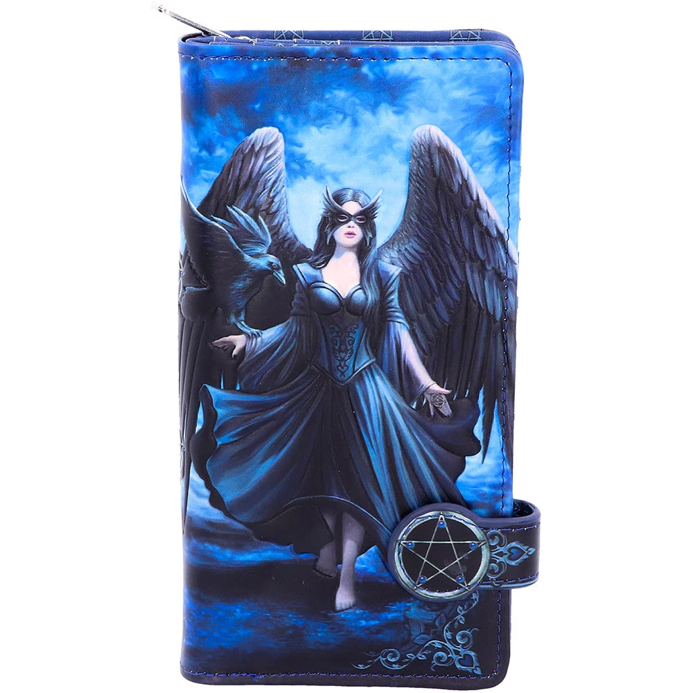 From the untamed imagination of Anne Stokes, walking through a moonlight forest, a winged woman strides barefoot over the uneven ground. Her large black wings arch behind her while a Raven lands onto her outstretched arm. Raven to her right, in her left hand she holds a small pentagram talisman. The beautiful embossed detailing enhances the magic and creates a striking 3D effect while the large compartments make it a wonderfully practical piece.