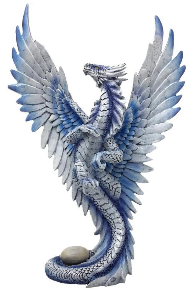 From Gothic and fantasy artist Anne Stokes comes the Age of Dragons range. The figurine depicts the adult Silver Dragon as she wraps her tail tightly around her egg, seemingly eager to soar into the moonlit sky. The scales on her wings look more like feathers as she raises them high into the sky, reflecting the bright white moonlight above. Cast in the finest resin before being hand-painted, this product is perfect for any Dragon enthusiast.