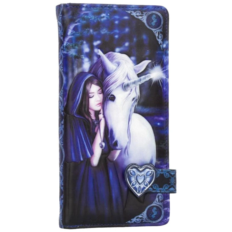 From the untamed imagination of Anne Stokes. In a moonlit enchanted forest, a young woman in blue robes holds a white unicorn tenderly. As they seek solace in each other, the tip of the unicorn’s horn lights up with pure magic. The beautiful embossed detailing enhances the magic and creates a striking 3D effect.