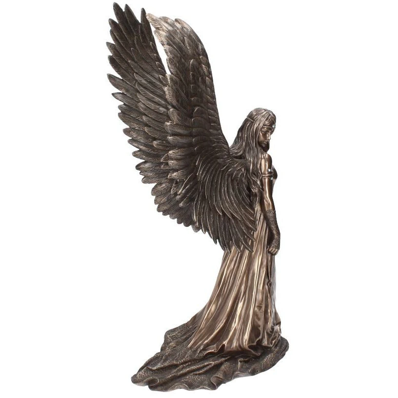 This fantastic angel figurine is designed by world-famous artist Anne Stokes and is part of a uniquely numbered run by Nemesis Now. Standing tall, this angel looks to her right, long hair flowing over her shoulders past her metal diadem. Her right hand hangs down by her side, holding a key on a chain as her long dress flows along the ground behind her. Long wings stretch out behind her, erupting from between her shoulders. Cast in the finest resin with a bronze finish, this enchanting angel figurine is a fantastic gift for anyone who feels they need some guidance in their life.