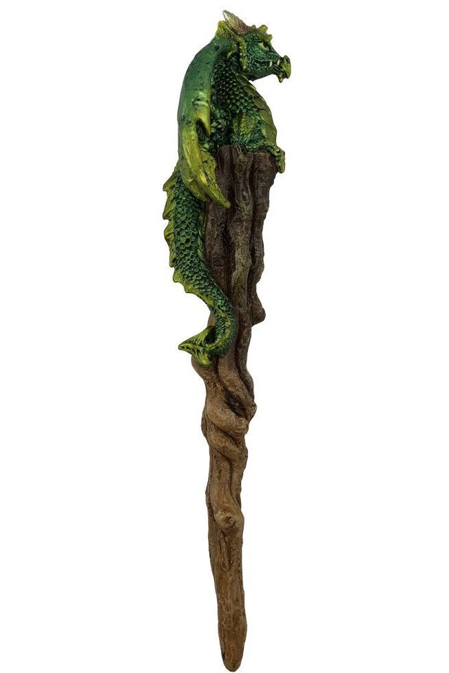 Imbue your magic with the majesty of a Dragon with the Argan wand. A gnarled brown branch twists around itself, rising from a thin tip. Atop the wand, a green Dragon is perched, wings hanging down and tail curled impatiently. Cast in the finest resin before being lovingly hand-painted.