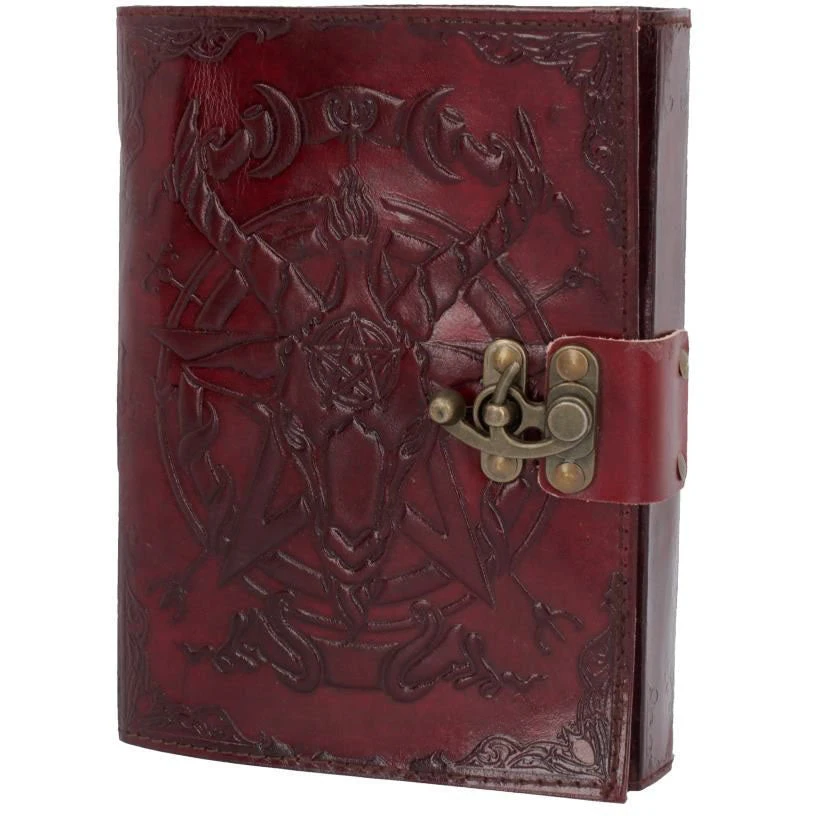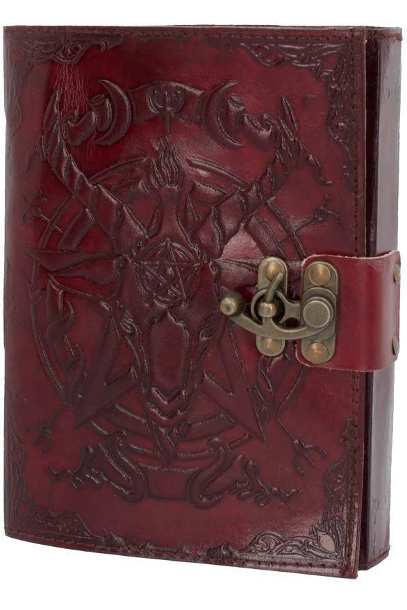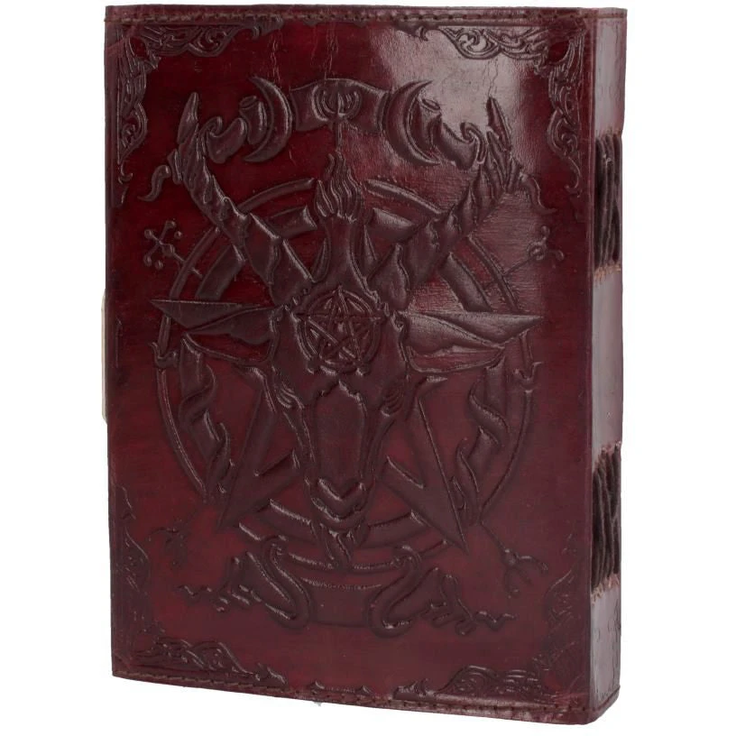 The cover of the journal is decorated with the head of a triple-horned Sabbatic Goat with a pentagram raised from its skull. Underneath the head, there rests a five-pointed pentagram, surrounded by intricate patterns. Above it, a pair of crescent moons sit while below it, the heads of two King cobras are poised to attack. This masterpiece is made of high-quality paper and has a leather-bound front cover that features one bronze metal clasp.