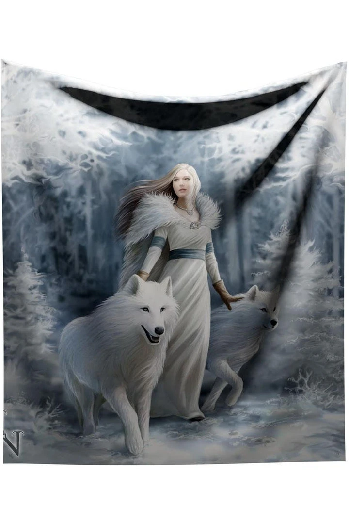 The throw features a beautiful ice maiden with a pair of stunning white wolves emerging from a wintery snow covered forest. The back of the throw is finished in a white ish cream tone sheep style fleece fabric while the front is soft with a short pile finish.