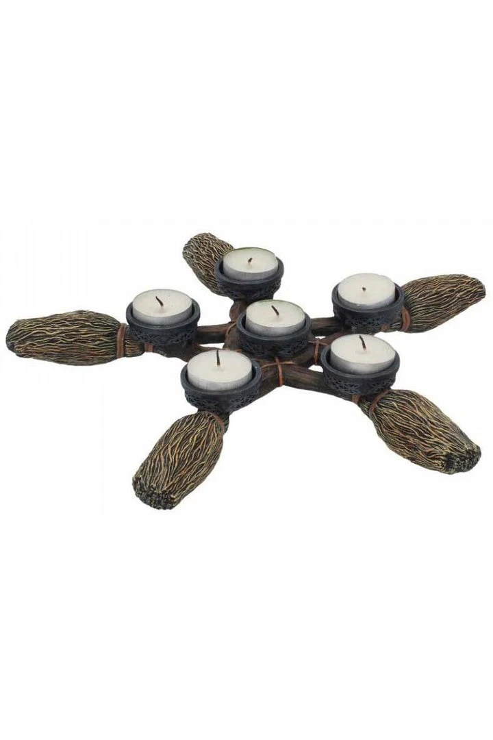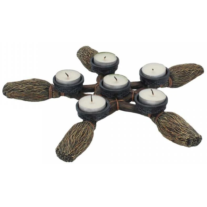 This stunning centrepiece is ideal for your next pagan gathering or ritual. Five witches’ broomsticks have been lashed together to form a magical pentagram. On top, six ornate tea light holders sit, decorated in repeating patterns. This highly detailed candle holder is lovingly hand-painted.