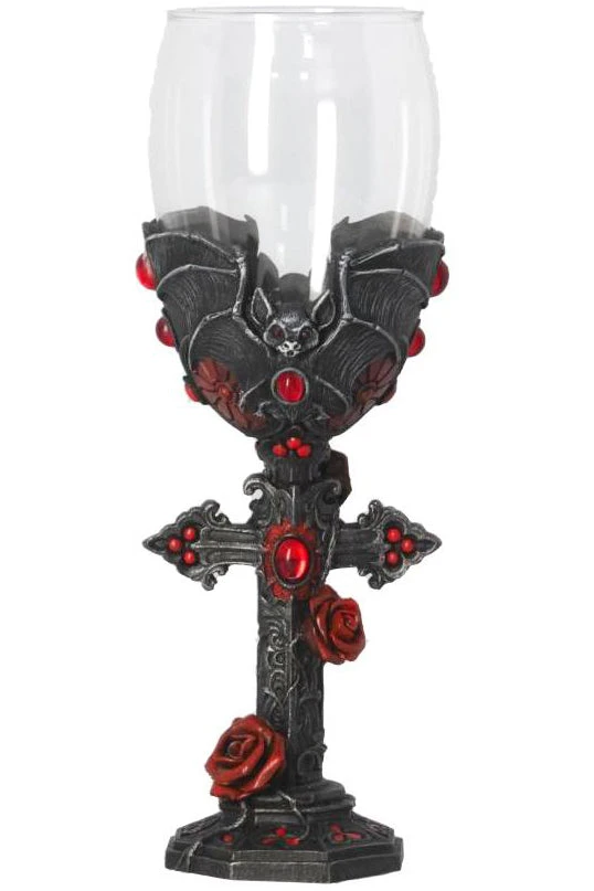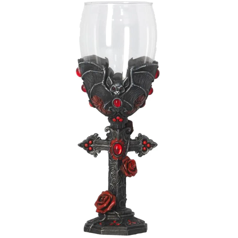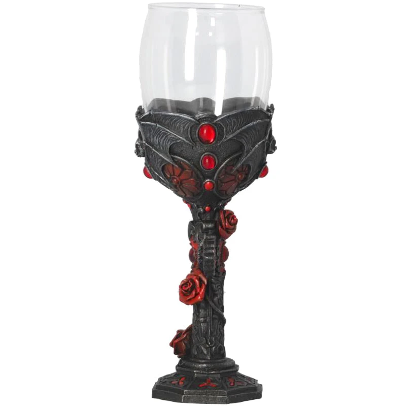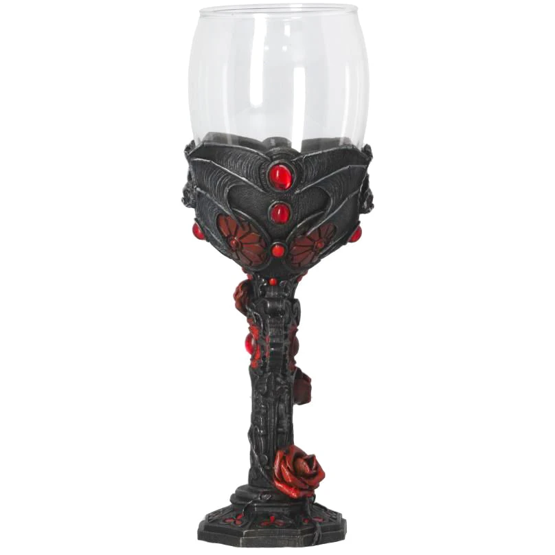A pair of menacing bats curve around the glass cup, holding it into place. The wing structure can be clearly seen on the bats, with raised bones and textured membrane, adding dimension to the piece. Between the tips of the wings at the side of the cup, four red stones sit, adding to the Gothic Charm. The stem is formed from an ornate cross, encapsulated by an intricate network of red Roses. Cast in the finest resin before being expertly hand-painted, this Goblet is perfect for any Dracula enthusiast.