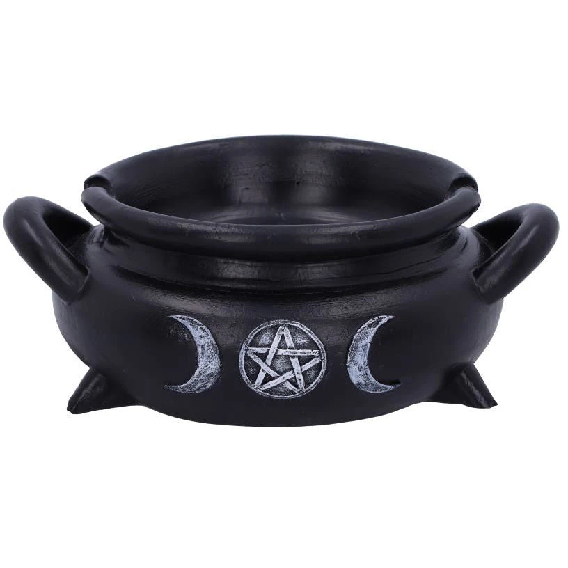 This cauldron incense burner is any occult enthusiasts dream. With a small space in the centre to hold your favourite incense stick, this cauldron has a matte black finish and features a silver pentagram at the centre, flanked by two crescent moons. Cast in the finest resin, this piece would make the perfect addition to any dark altar.