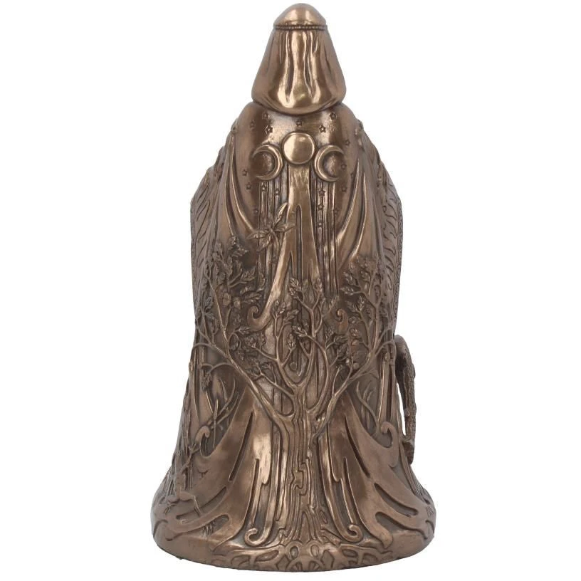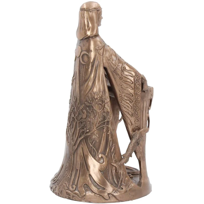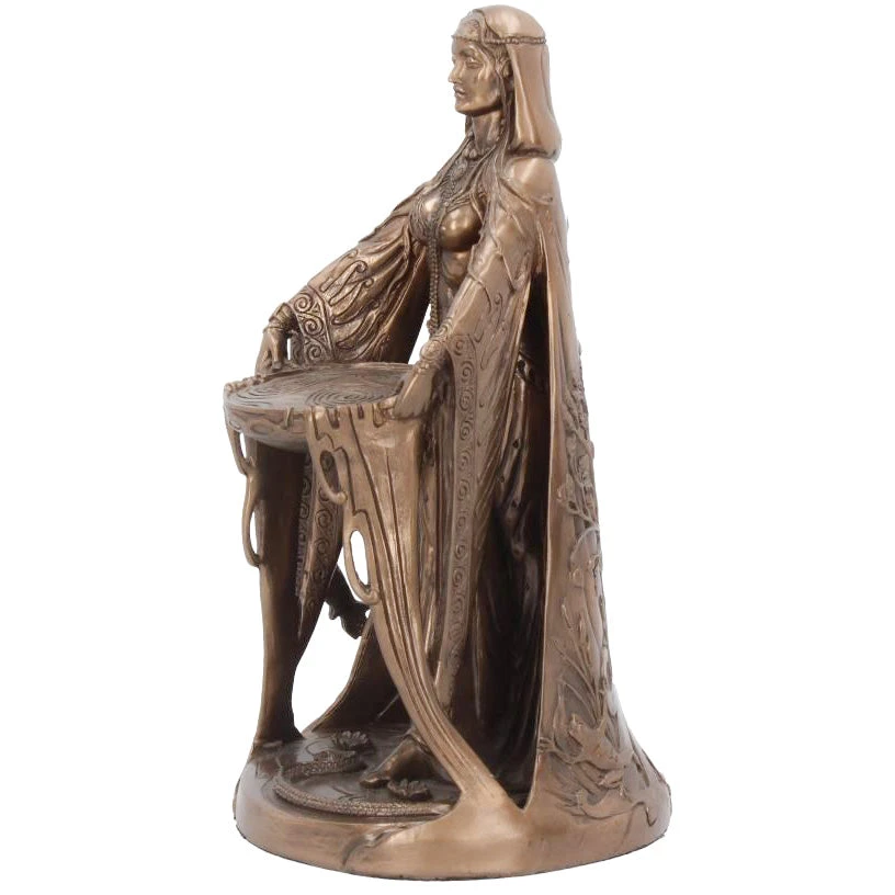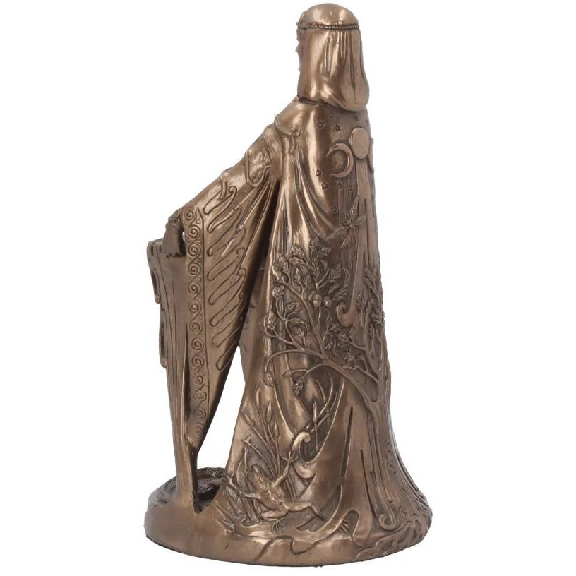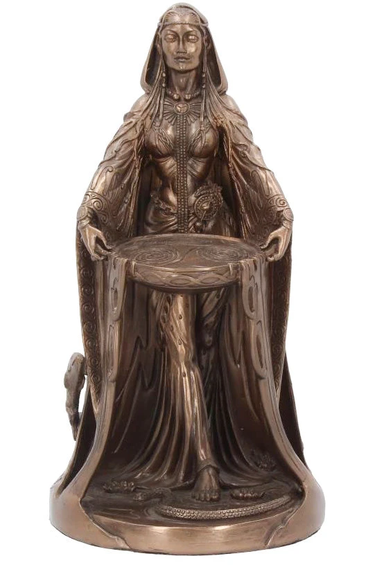 Cast in the finest resin before being given a bronzed finish. Danu is the most ancient of the Celtic gods. She is referred to as the mother of the Irish gods, which infers that she was a mother goddess. Here she is seen wearing a cloak featuring the Celtic Tree of Life below the symbol of the Triple Moon. Often associated with rivers, symbolising fertility and abundance, she holds a bowl filled with water that is cascading over the edges while a fish leaps forward on her right side.