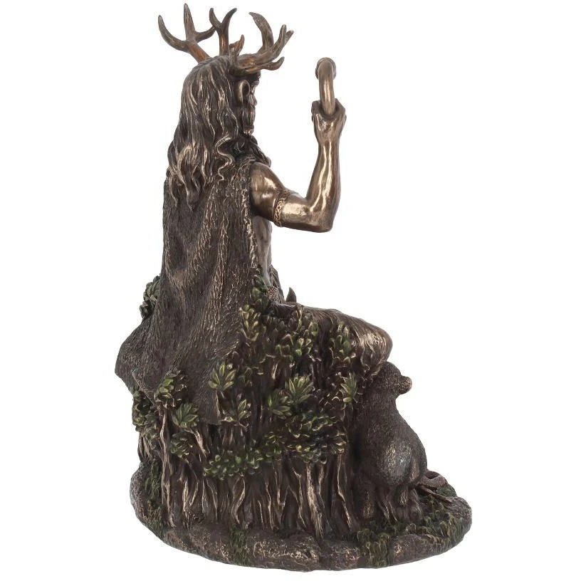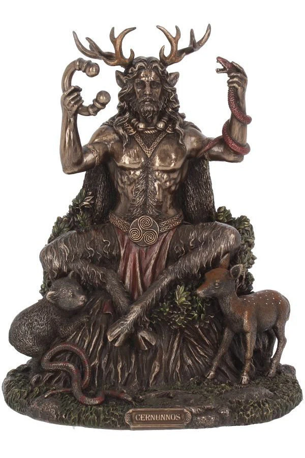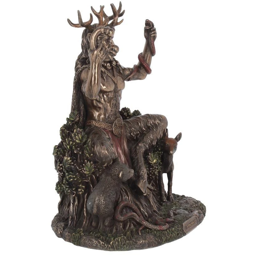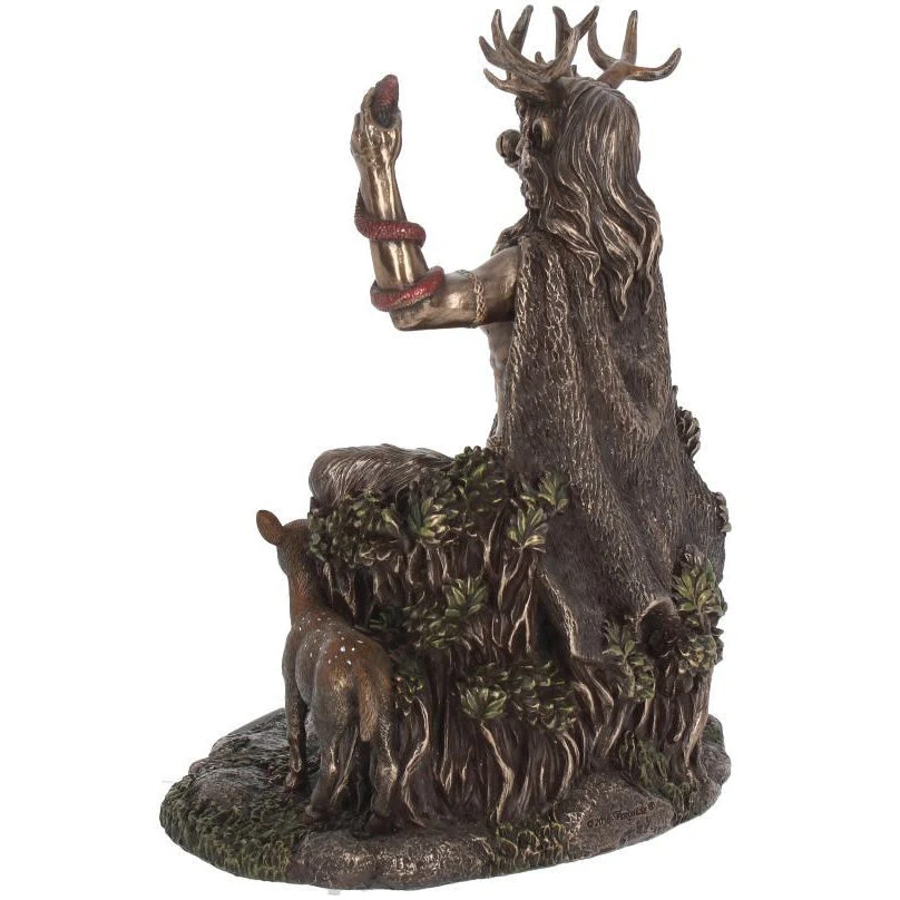 This magnificent figurine is cast in the finest resin before being given a bronze finish and painstakingly hand-painted. Sitting on a tree stump, surrounded by animals, sits Cernunnos, the Horned god of the forest from the myths of the Celts. Over crossed shaggy goat legs, a red loincloth is held in place with a golden belt. A large triskelion sits on the belt buckle, intertwining spirals swirling clockwise. His muscular torso is exposed and hairy, and a long cloak hangs down his back. Looking forwards with an air of wisdom, his majestic antlers emerge from beneath his long hair. In this left hand, he holds a red snake by its head, and in his right he holds a large bronze torc, symbolizing power and riches. Around his feet, a snake, a faun and a bear cub all frolic. Perfect for the modern pagan, this fantastic Celtic figurine is the perfect centrepiece for any alter or coffee table.