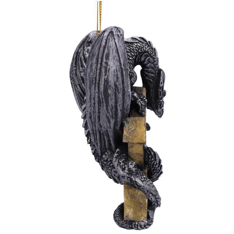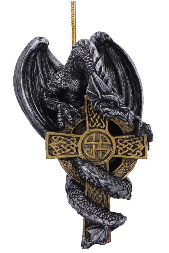 Suspended from a golden thread, this beautifully crafted Dragon coils around his treasured metallic golden Celtic cross. Decorated with elaborate patterns, this piece would make a quirky festive accompaniment or would be perfect as a year-round piece of fantasy decor. Cast in the finest resin before being lovingly hand-painted this piece is perfect for those who have an affinity for mythical beasts.