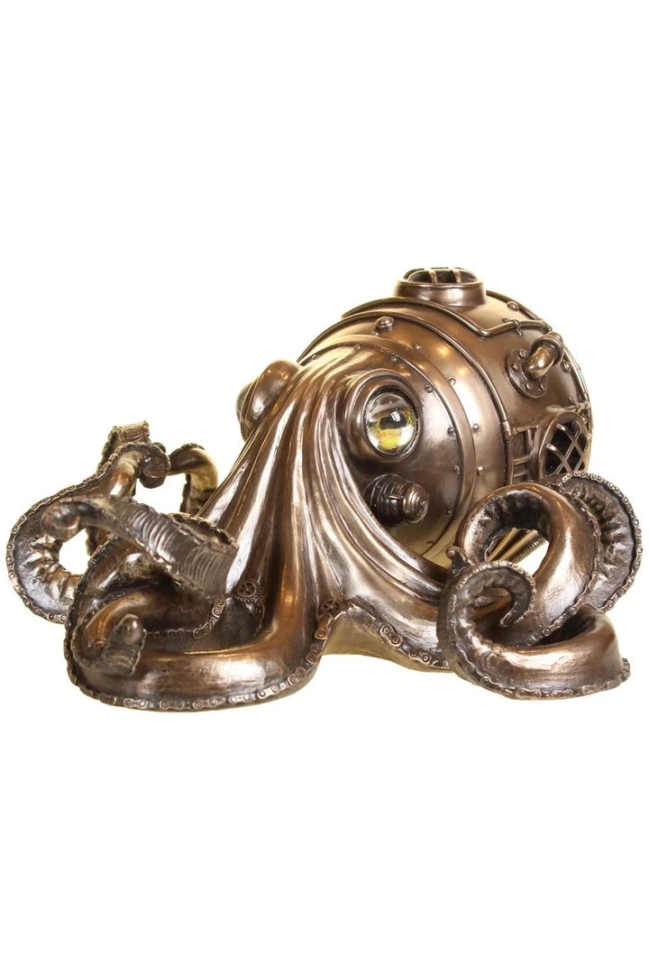 This stunning Steampunk Octopus figure made from a heavy resin with a realistic looking metallic bronze finish will add a touch of Steampunk class to any home! His tentacles are edges with gears and bike chain detail while his head appears to be formed of a nautical driving helmet/capsule. His glass eyes give him added character and he will be equally at home mounted on your wall or sitting on a flat surface.