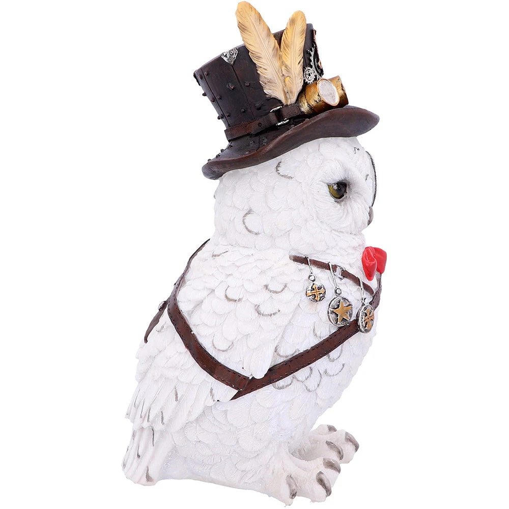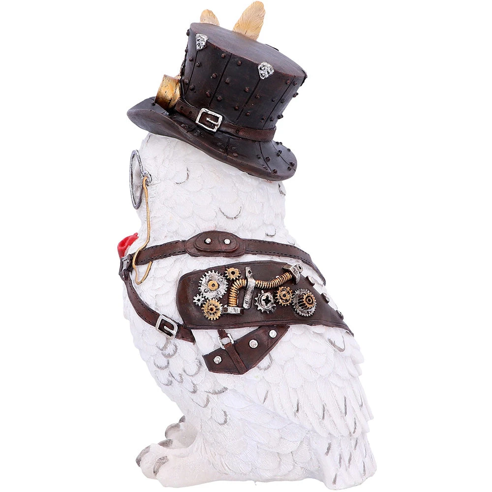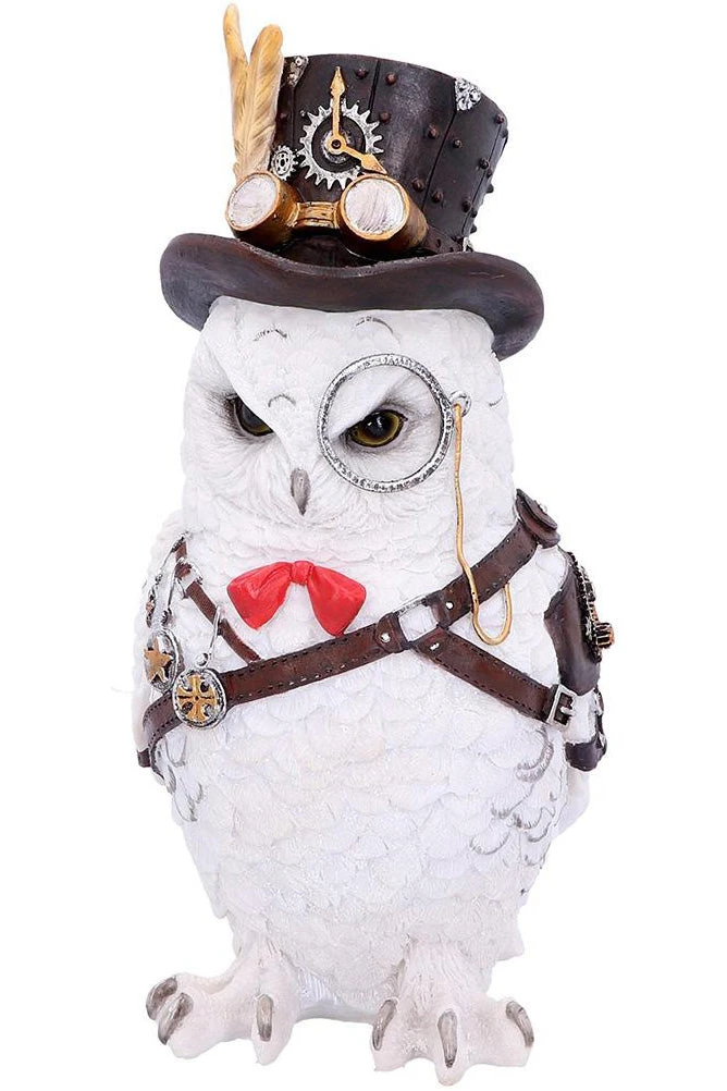 This dapper owl comes filled with Steampunk style. Our Snowy feathered friend stands proudly. One thick leather strap runs diagonally across his breast as a small red bow tie sharply contrasts to his white body. Small medals hang from a thinner strap while his left wing fits neatly into a leather brace. On his head, a small top hat sits, complete with a pair of goggles. Cogs, gears, springs and rivets decorate his outfit while a monocle sits comfortably over his eye. Cast in the finest resin before being painstakingly hand-painted, this item will look great on any bookshelf or mantel.