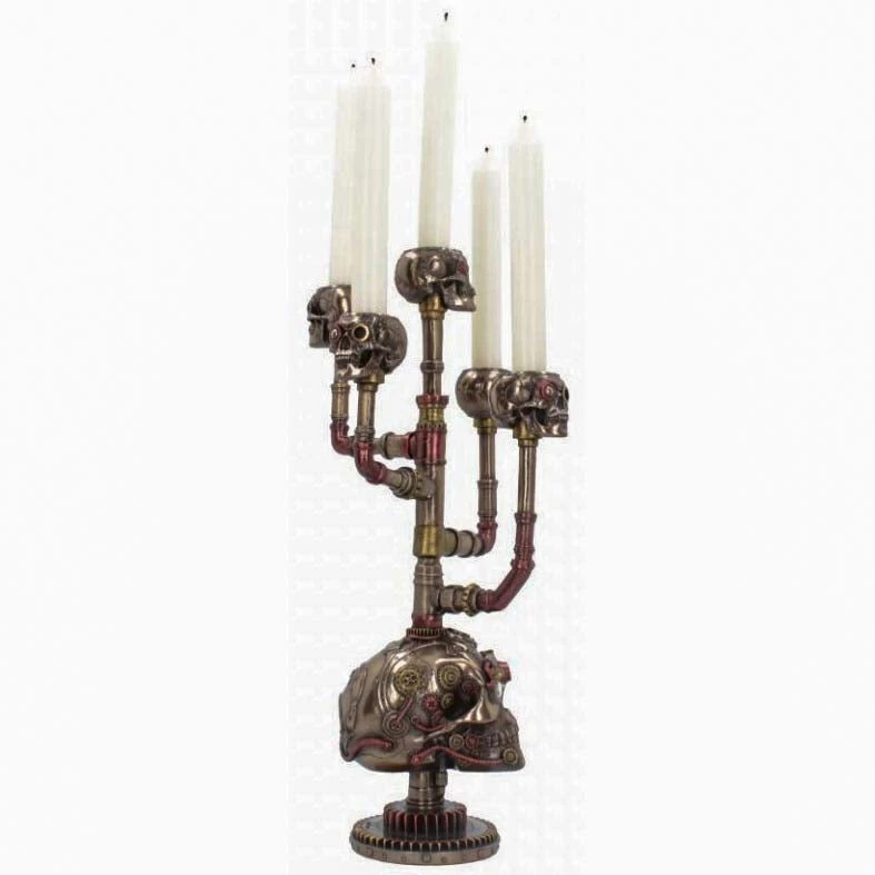 This Steampunk candelabra is cast in high-quality resin before being given a bronze finish and carefully hand-painted. Staring straight ahead, the base skull emerges from two large gears. Holes in its metal cranium allow cogs and dials to emerge, working some unknowable mechanism, while wires snake over the forehead. The left eye is covered by a bronze monocle, pipes connected for some unknowable arcane purpose, while the right eye is exposed, revealing a rainbow-hued eyeball. From the top of the skull a hefty pipe arises, this divides into smaller tubing which holds miniature bronzed skulls, each with space to fit a candle. This alternative item makes the perfect gift for any mad scientist or technologically-minded necromancer.